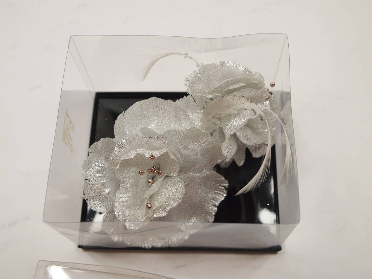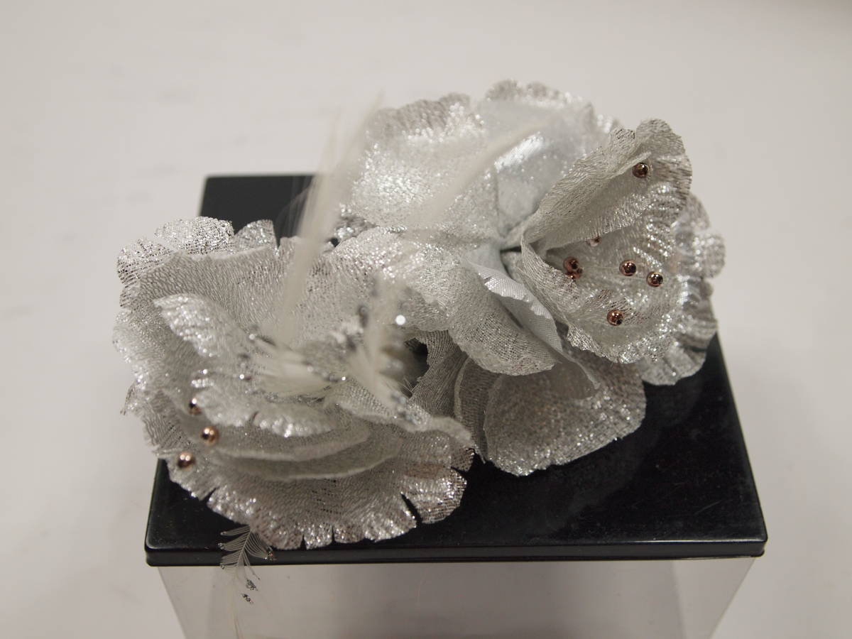コサージュです(髪飾りかもしれませんがピンが付いてますのでコサージュだと思われます)。 古いものですが状態はきれいです。