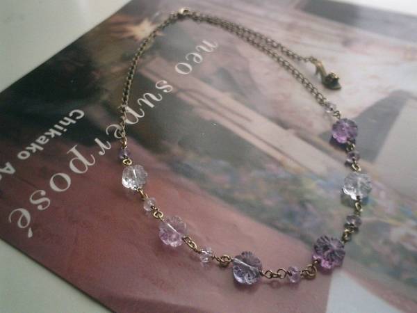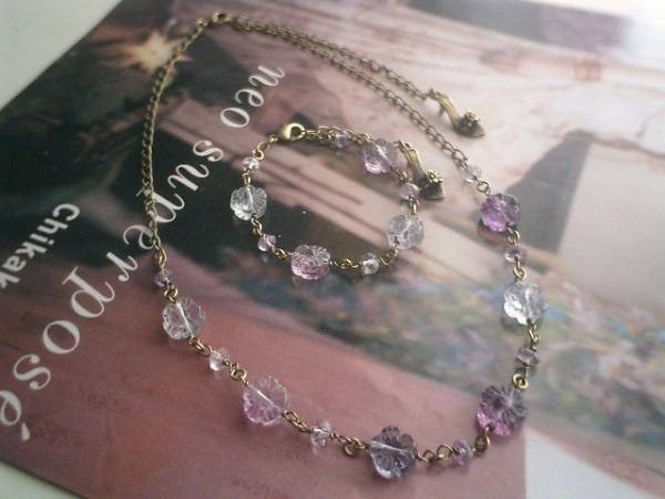 ベーシック・スタイル・・シリーズです♪花の妖精・・ロマンチックなフローライトとアメジストのネックレスとブレスレットです♪6ミリのボタンカットのアメジストに10ミリ位のお花のフローライトを合わせました♪繊細なお色が可憐な表情です♪ネックレスの長さは全長56センチ位で調節自由です♪ブレスレットは全長23センチ位で調節自由です♪それぞれ単品やお揃いのネックレスも出品しています♪シンプルで飽きのこないいつまでも着けられるデザインを考えて作りました!ハンドメイドをご理解頂いてノークレーム、ノーリターンでお願いします
