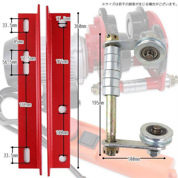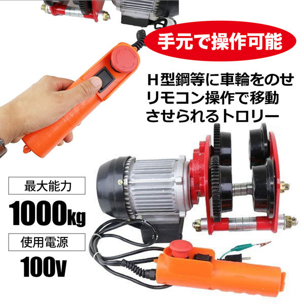 | ★軽々移動で便利!★ 電動トロリー 1000kg 【ポイント】 H型鋼等に車輪を乗せリモコン操作で移動させられるトロリーです。 幅はワッシャーの数を調節して最適な懸架状態を得ることができます。 【商品名】 電動トロリー 1000kg 【商品番号】 trolley-et1000 【商品仕様】 ・最大能力:1t (1000kg) ・移動速度:13m/min ・モーター能力:300w ・モーター回転:1400rpm ・最小回転半径:1.5m ・外径寸法:約330mm×400mm×200mm ・適用H型鋼:#14-#22 ・トラック幅:80-112mm ・使用電源:100v ・重量約:18kg ・生産物賠償責任保険付(PL保険) 【注意事項】 ※輸入品につき本体に僅かなキズ・さび・<汚れなどがつく場合があります。※色合いの感じ方には個人差があり、撮影状況・PC環境により色合いが異なる場合がございます。 ※細かい点が気になる方、神経質な方はご注文お控えください。 ※使用中に発生した、人のけがや物品の破損など保障いたしません。十分に気を付けてご使用ください。 ご注文前に必ずご確認下さい ⇒ お買い物ガイド |