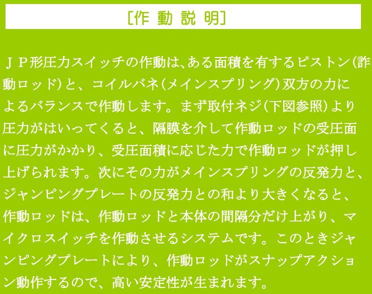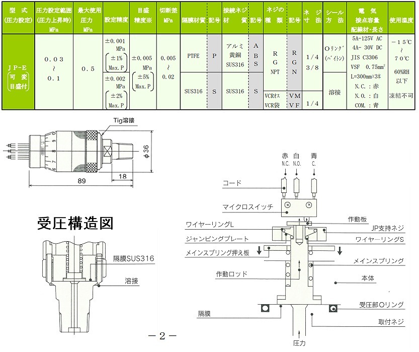 | 圧力機器メーカーの株式会社山陽計器製作所製 微圧用設定可変タイプ圧力スイッチ プレッシャースイッチ JP-E-SS です。 ★微圧用の高精度設定可変タイプです。 ★作動安定性、安全性が高く、高精度作動圧力設定ができます。 ★耐食性、耐孔食性に優れたモリブデン配合SUS316隔膜タイプ。 ★出力は、コモン(青線)、ノーマルオープン(白線)、ノーマルクローズ(赤線)です。 ★試験機から取り外したもので(空気を使用)、使用頻度少なく、美品/動作品です。 ★チューブ外径8mm用のワンタッチ接続ポートを取り付けていますので、そのまま出荷します。 到着後1ヶ月以内の不具合には返金など、きちんと対応します。 【主なスペック】 圧力設定範囲 :0.03~0.1MPa 最大使用圧力:0.5MPa 接続チューブ外径: 8mm (8φ) 設定精度:±2%Max P 目盛精度:±5%Max P 切断差:0.005~0.02MPa 送料全国一律600円。(レターパックプラス) インボイス対応領収書発行可能です。 |