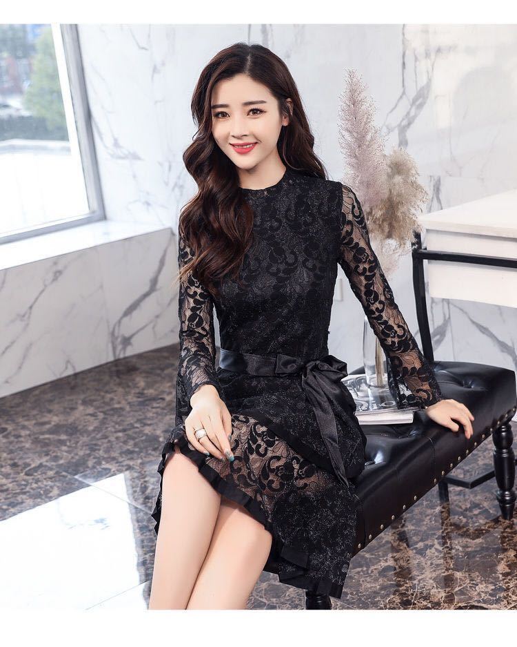 ペプラムドレス、マーメイドドレス、レースワンピース、膝丈ワンピース、裏地あり、透け感ややあり、伸縮性なし、取り外し可能リ、ボンベルト、ベルトループなし、ポケットなし、背中ファスナー