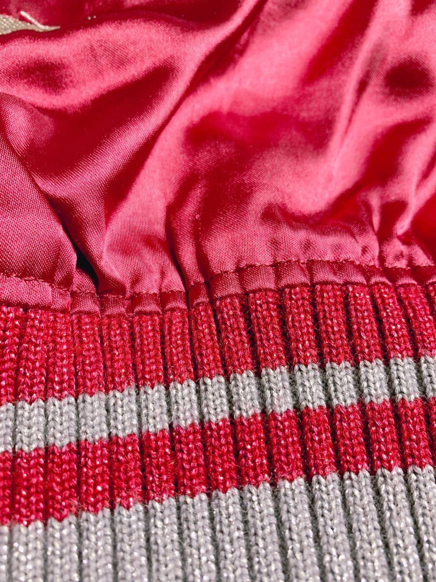 襟、袖口、裾はシルバーラメとレッドラメのニット、キラキラで最高に可愛いです。二重になっていて風を通しにくく暖かいです。