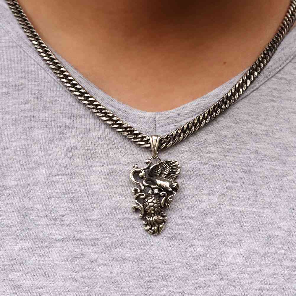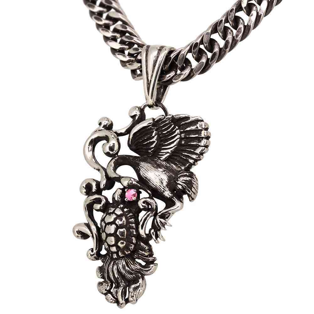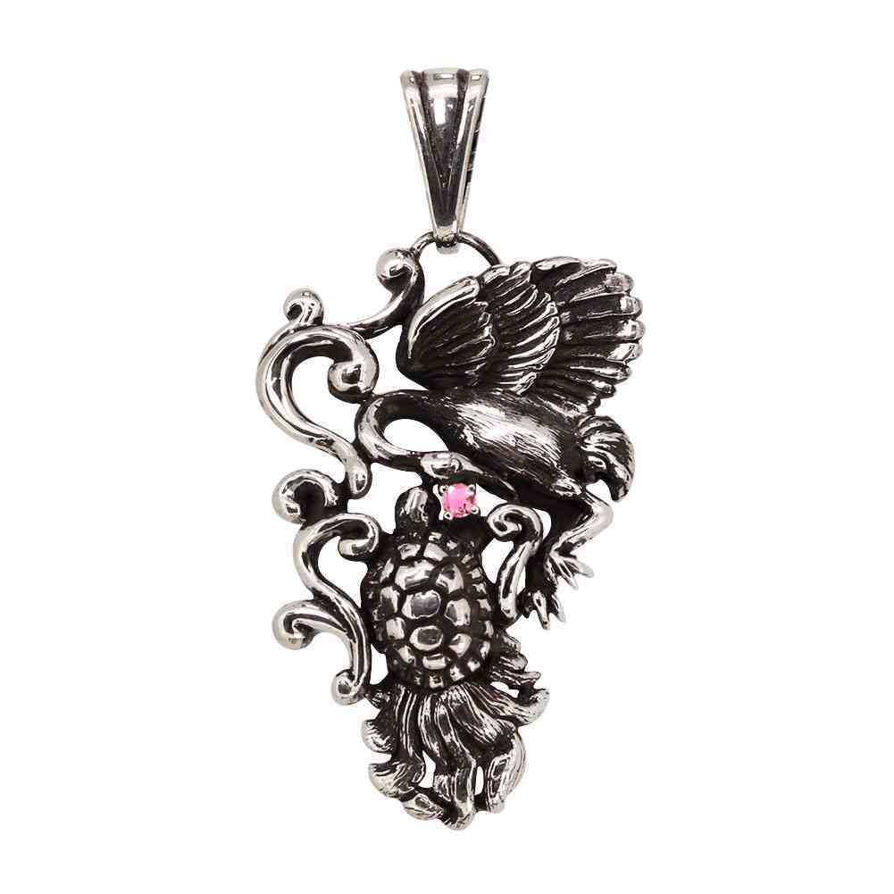 10月誕生石ピンクトルマリンを使用したシルバー製の、鶴と亀モチーフのメンズペンダントヘッドです。