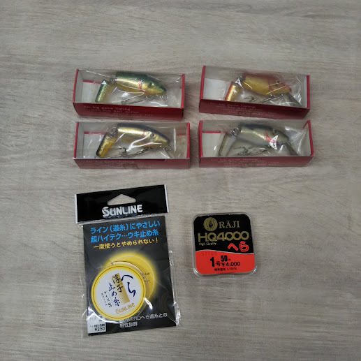 【商品名】ルアーと釣り糸セット 【商品説明】ルアー4個/テグス2種類こちらの商品は未使用品ですが長期倉庫保管品のため中古品扱いとしています。長期保管品のため、商品本体やパッケージ等に擦れや傷、破れ、劣化等がある場合がありますので、完品をお求めの方はご購入をお控えください。(状態は写真にてご確認ください。)長期倉庫保管品・中古品の為ご了承の上でご購入お願いします。また、万が一、在庫がない場合はキャンセルしていただくことがありますが予めご了承ください。*ノークレーム・ノーリターンでお願いします