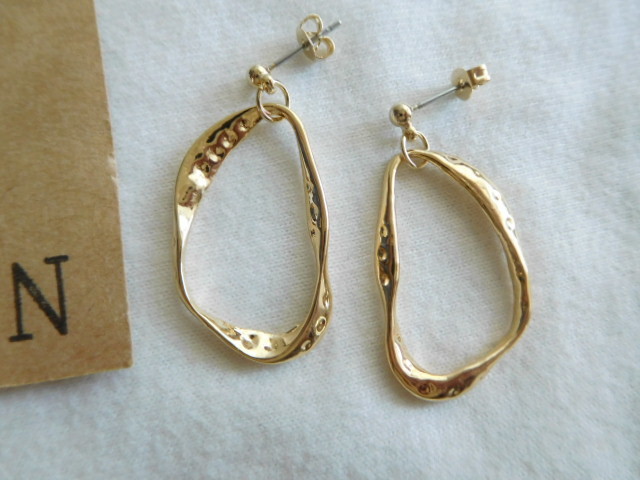 ゴールドカラーのねじれサークルピアスです。いびつなサークルが雰囲気あり素敵です。こちらは2サイズ出品しております。こちらはSサイズです。
