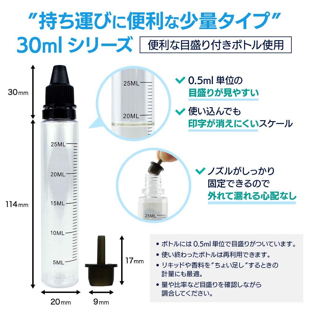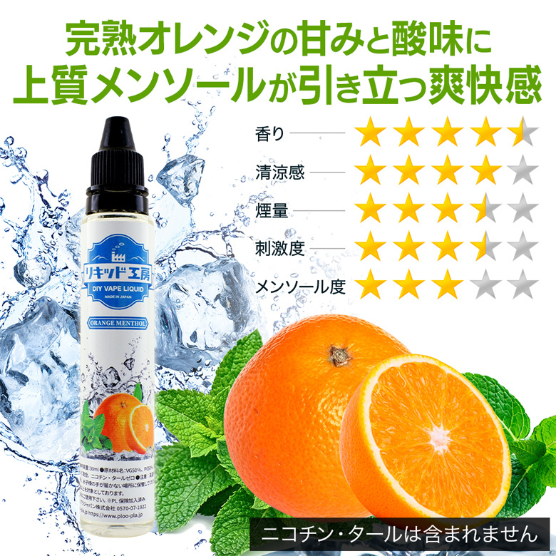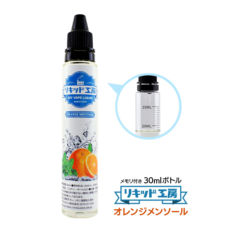 【リキッド工房から30mlシリーズ新登場】完熟オレンジの甘みと酸味に上質メンソールが引き立つ爽快感。独自の製法により監修、製造した本格派フレーバーリキッドです。安心安全な国産。日本国内の衛生管理の行き届いた工場で製造しております。※厚生労働大臣指定の食品添加物のみ100%配合 【最高のコストパフォーマンス】お客様のご要望により国産リキッドメーカーとして素材の品質を落とすことなく味、香りにこだわったリキッドの開発に成功しました。そのままでも十分にお楽しみいただけますし、他のフレーバーや香料等と混合して自分好みの味に仕上げることもできます。<セット内容>リキッド工房 オレンジメンソール 1本<商品仕様>■ボトルサイズ:30ml■ボトルタイプ:プラスチックボトル(0.5ml単位目盛付き)■成分:食品用グリセロール純度99.7% 食品用プロピレングリコール99% 天然日本ハッカ 食品用香料■混合比率:VG50%PG50%■香料:ニコチン・タール・有害物質:なし■日本食品分析センター検査済み:発がん性物質検出されず