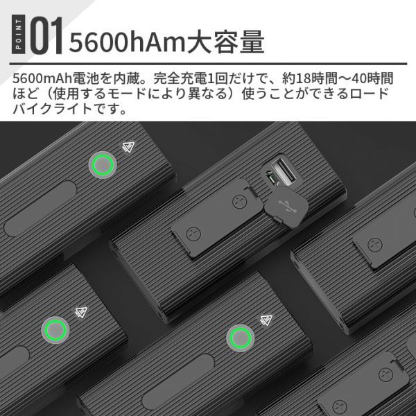 【1200LM高輝度&5600hAm大容量&3つの調光モード】超明るい1200ルーメンのL2 LEDを3つ搭載しているので、夜間運転中の視認性を高めることと、周囲のドライバーや歩行者に自転車の存在を知らせることに役に立つ自転車ライトです。5600mAh電池を内蔵、完全充電1回だけで、18h~40h使うことができるロードバイク ライト です。たまたま充電すれば十分です。ハイビーム、ロービーム、フラッシュ、三つの調光モードを配置しています。道路状況と、無駄な電池の消費を抑えるため、状況に合わせてモード切替できるライト です。