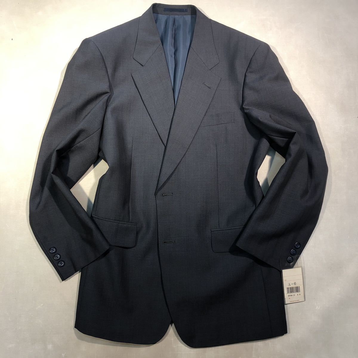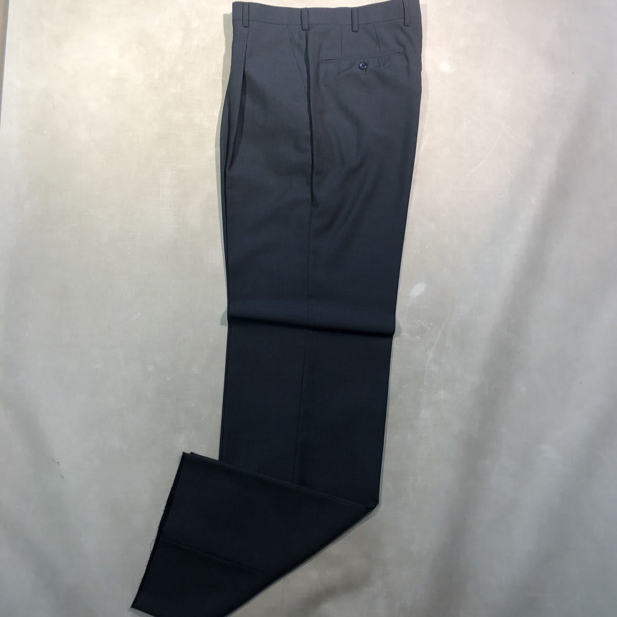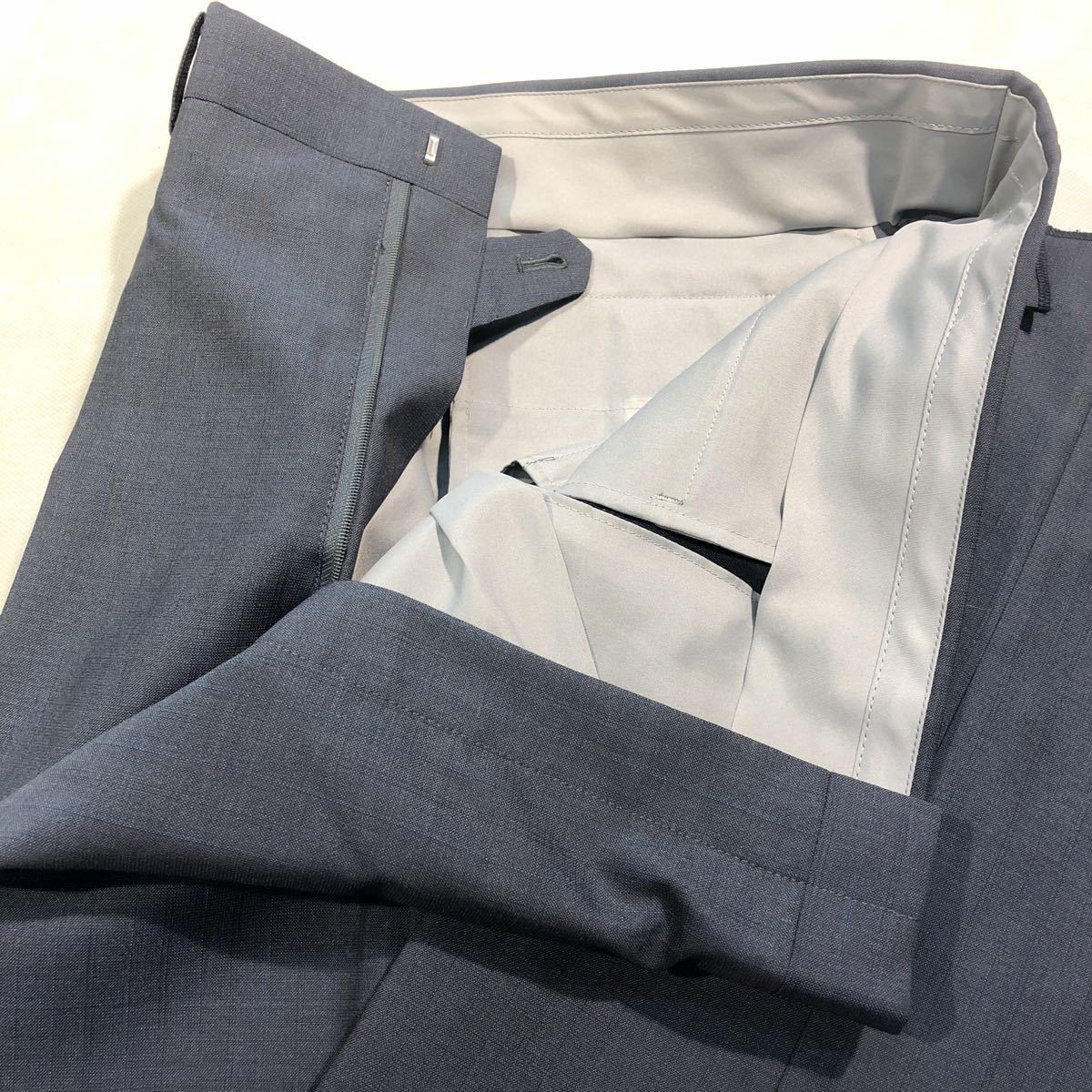 お色はブルー系。艶のあるとてもキレイな色目に仕上がっています。これからの季節はジャケットのみスラックスのみでコーディネートしても良いと思います。また近年はインナーも進化している為、この商品同様動きやすい薄手のスーツを一年通して着用される方が増えています。生地はふわさらですが、とても丈夫で大事に着用頂ければ軽く10年は持ちます。この機会に是非チェックしてみてください。