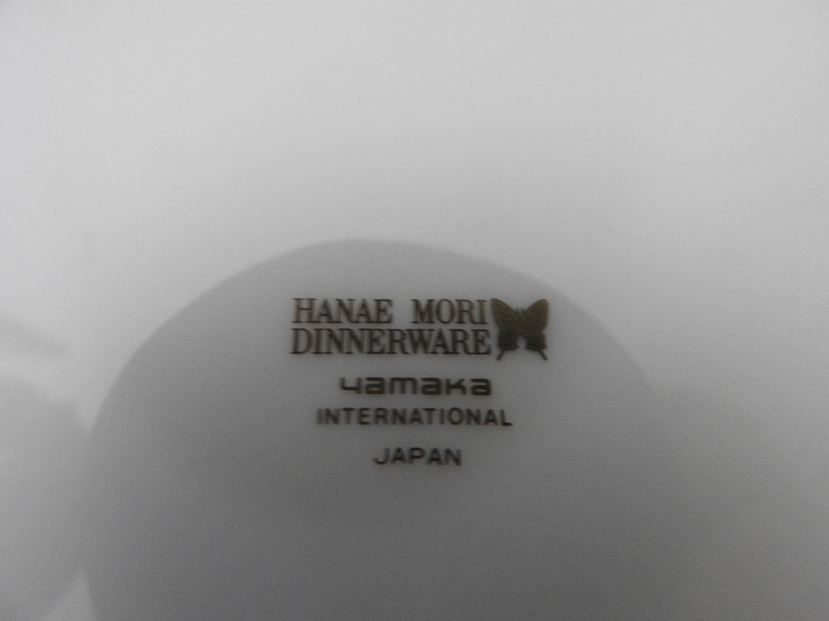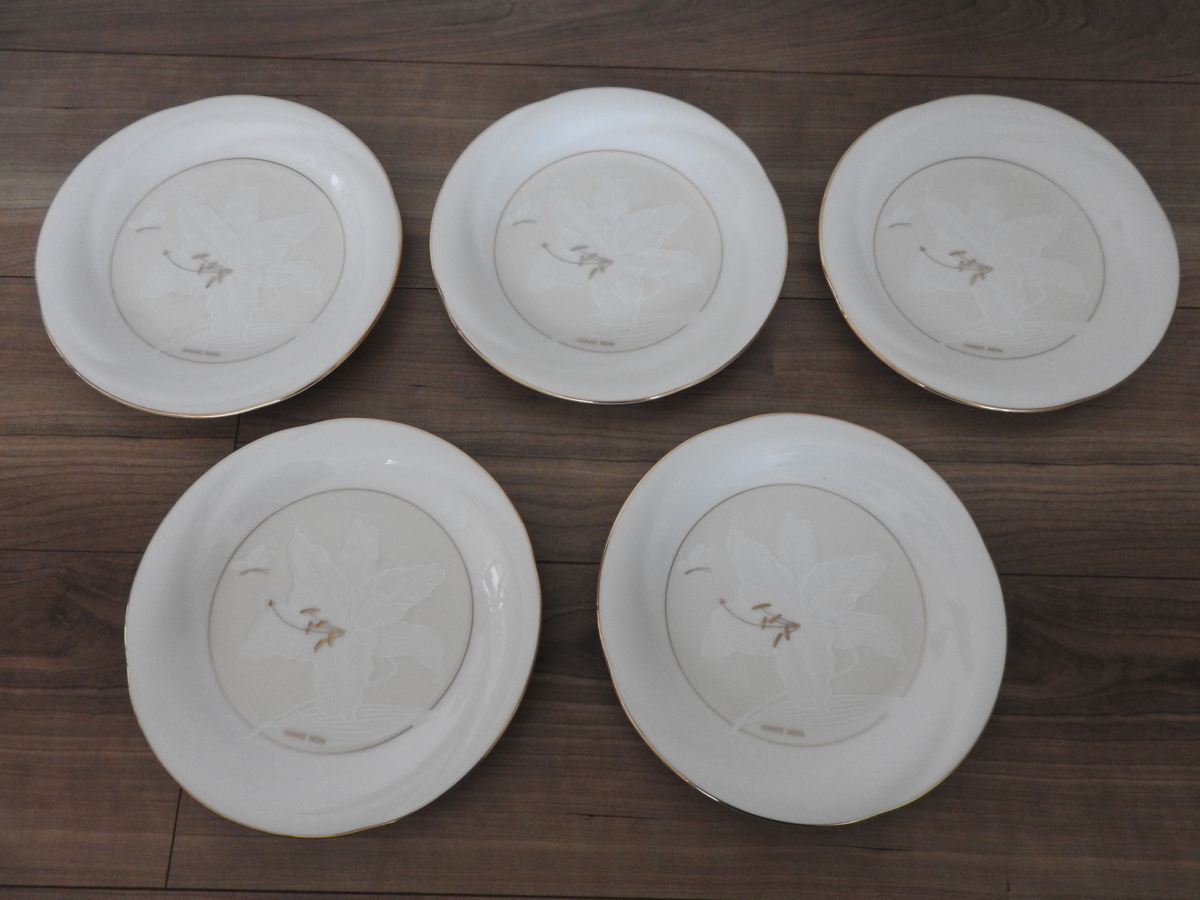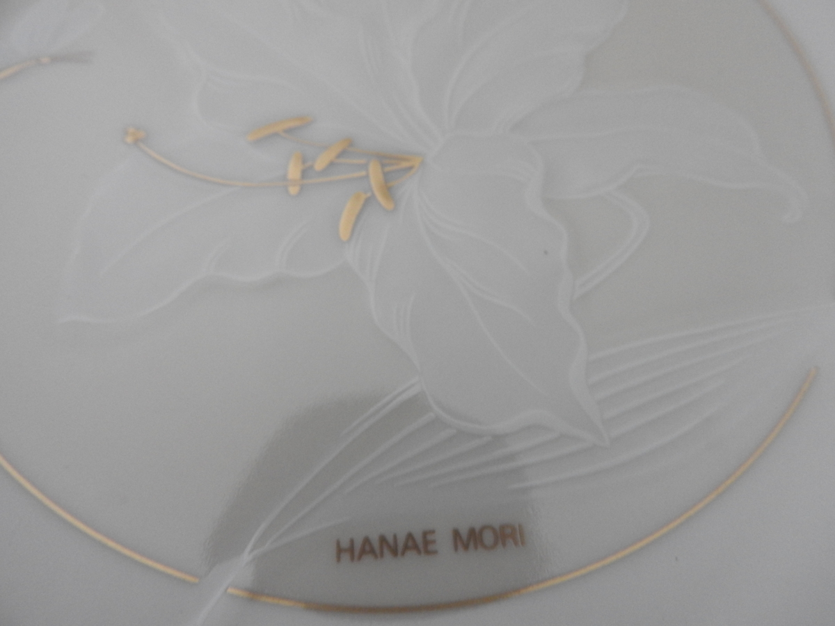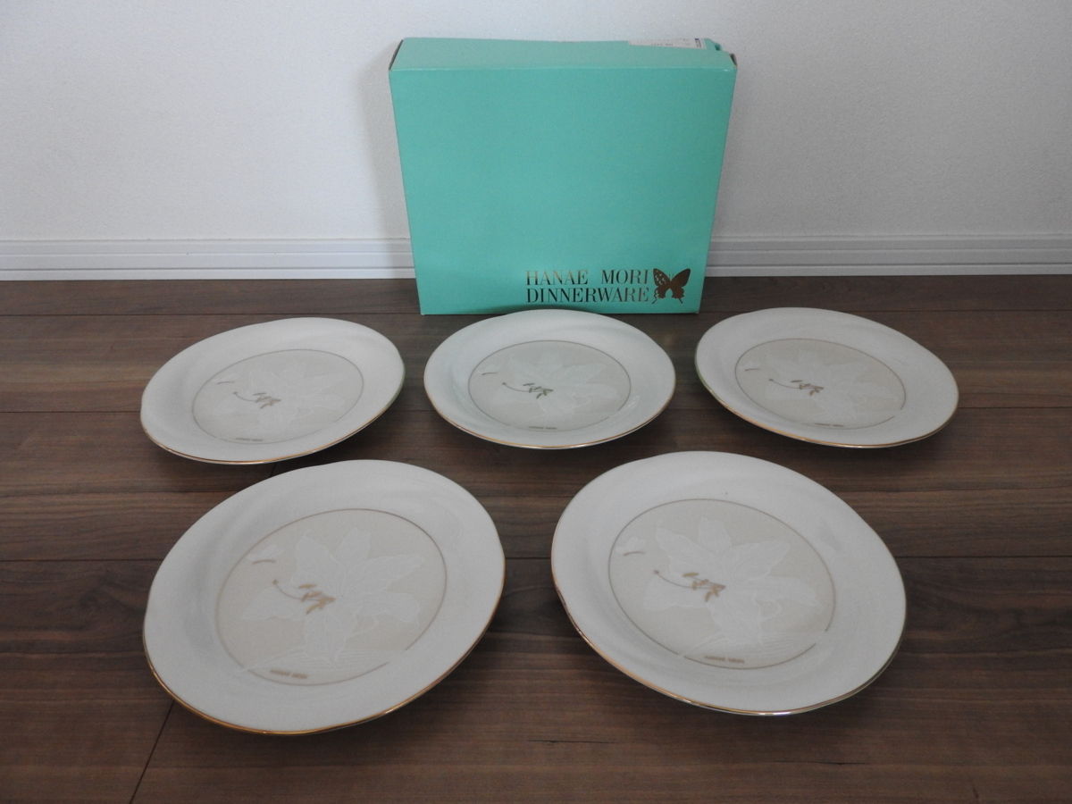 HANAE MORI 森英恵 ケーキ皿 白 金縁 5枚セット 箱付になります。 保管期間ございますが、未使用品になります。 【サイズ】 直径 19cm 高さ 2cm 状態も含めて写真にてご確認下さい。 | ||||