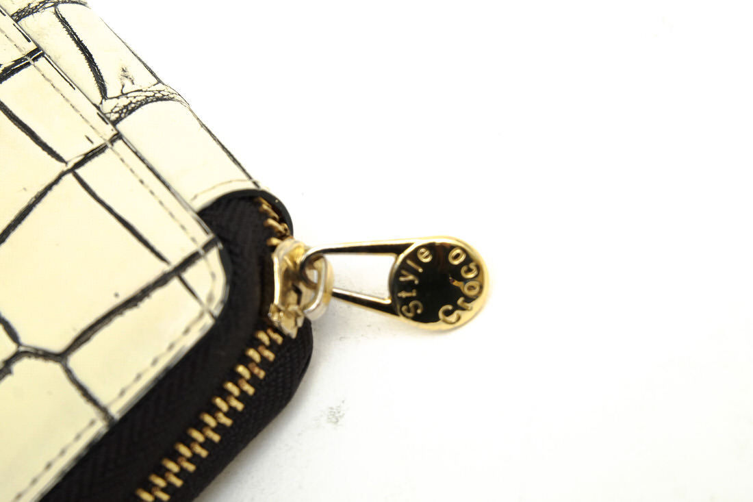 谷染め (目地染め) のクロコダイルを贅沢に使用、バニラカラーが美しいスタイルクロコのレザーウォレット。迫力ある腑模様とコントラストが印象的です。クールな女性の魅力を演出してくれ、ファッションのアクセントに最適です。 |