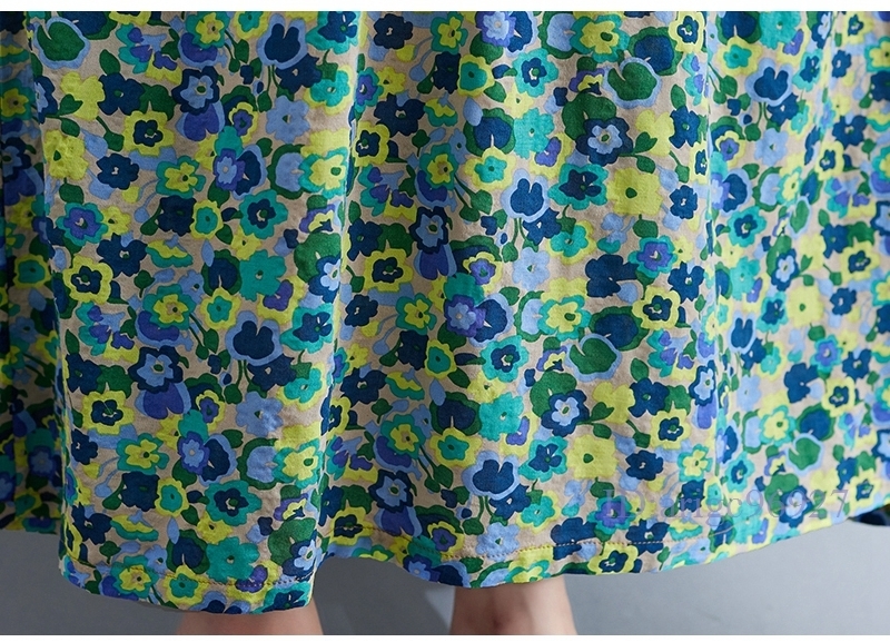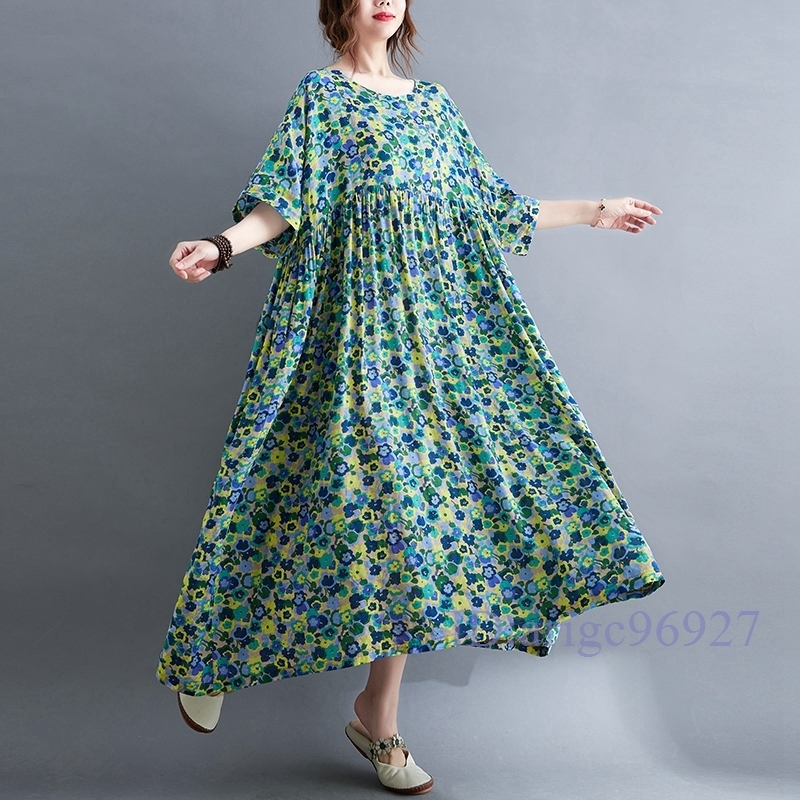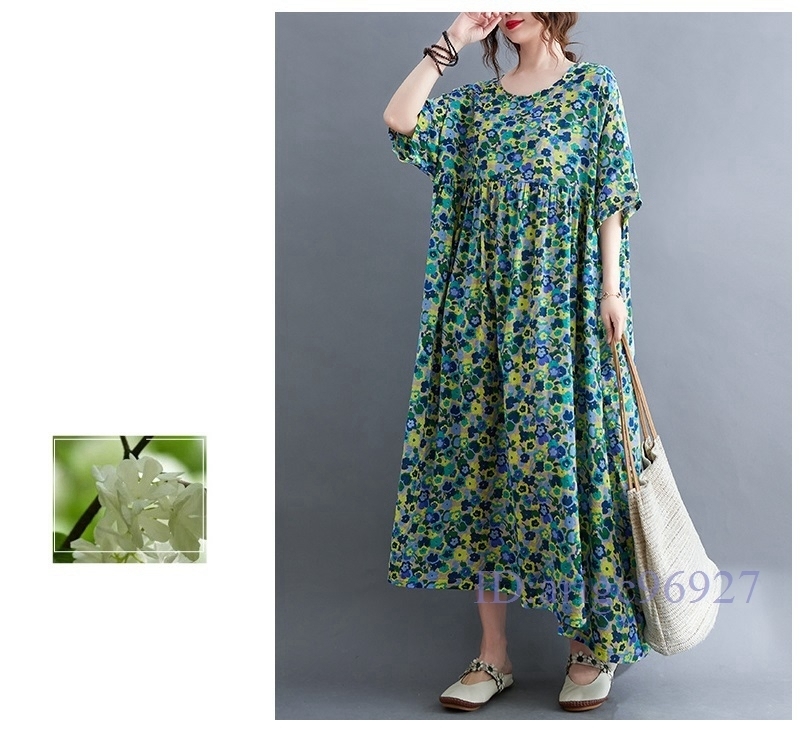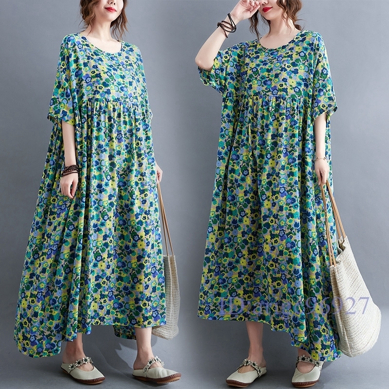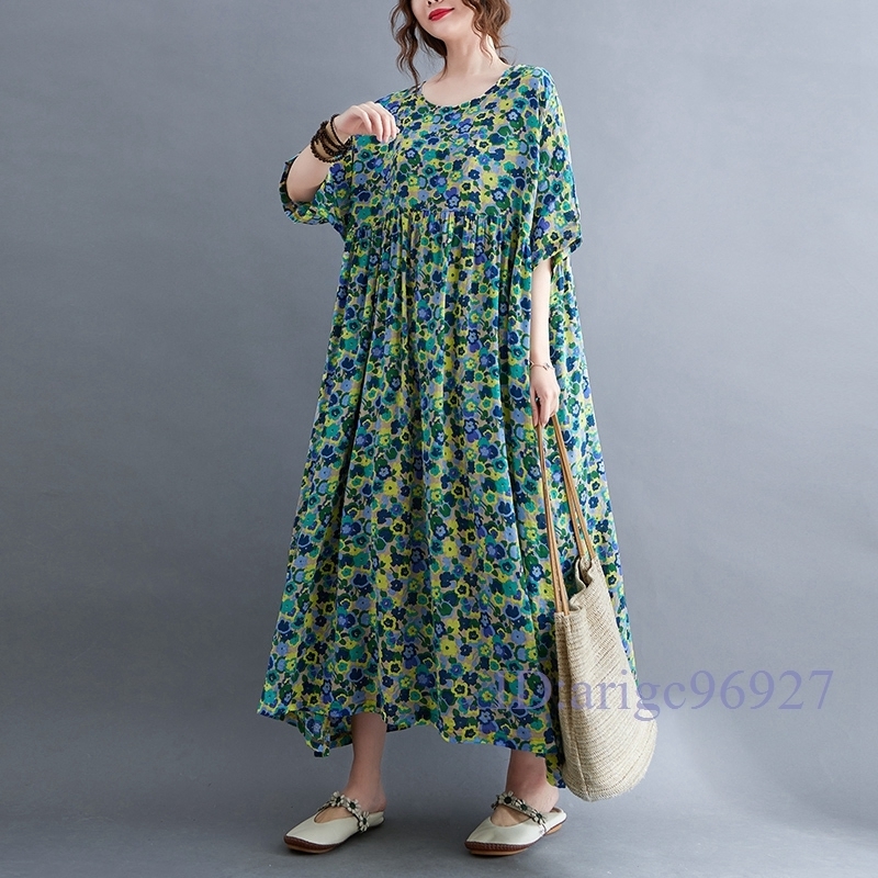 N015★新品春夏**レディース*カジュアル*ゆったり大きいサイズ体型カバー*小花柄*半袖マキシロングワンピース*グリーン