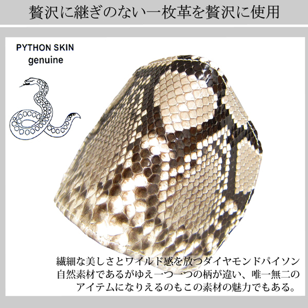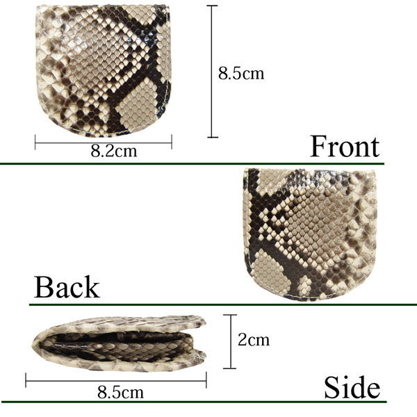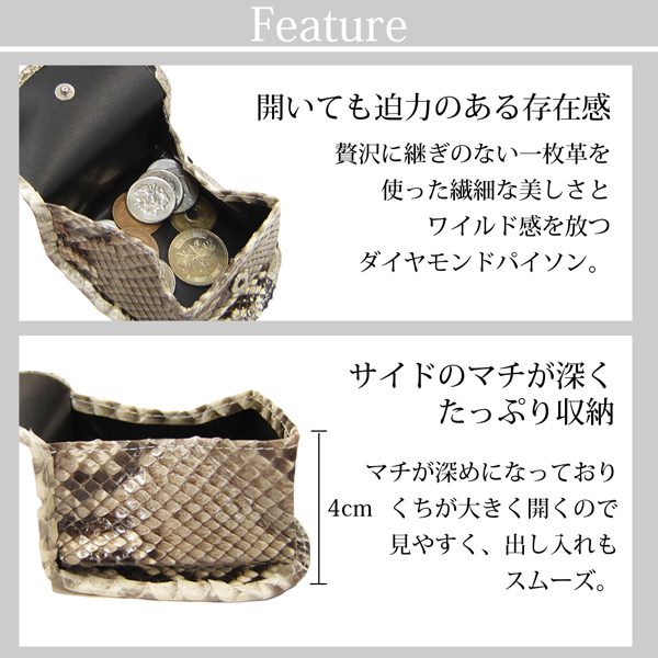 | 贅沢に継ぎ目のない一枚革を使った繊細な美しさとワイルド感を放つダイヤモンドパイソンの小銭入れ。 自然素材の為え、1点1点柄が違い唯一無二のなのもこの素材の魅力でもある。 中国で蛇革は金運、幸福、財運を呼ぶと言われており、その縁起のいい革を贅沢に使用。 小銭入れのマチは4cmと深くかさばる小銭もしっかり収納できます。 ■定価14800円 ■サイズ(約):横8.2cm×縦8.5cm×厚み2cm (実寸につき誤差はあらかじめご了承ください) ■素材:外側/ダイヤモンドパイソン、内側/PU ■仕様:小銭入れ×1 ■新品・未使用 ○当店の製品に使用されている全ての皮革は、野生生物保護のもとで飼育され「ワシントン条約“CITES/サイテス”」により適法に輸入されたものです。 ※ご注意※ ・パイソン素材は天然皮革を使用しているので「斑(ウロコ)」の出方に個体差があります。 ・天然素材の為、商品により柄の出かたが異なります。画像は代表的な柄(班)を載せております。 ・柄でのお取替えは出来ませんので予めご了承ください。 ・パイソンの斑は商品により浮いてる箇所がある場合が御座います。そちらは不良では御座いません。 --製品について-- ・厳選された上質な素材を利用しておりますが、染料の性質上、水や汗、摩擦等により色落ちします。淡色製品との併用は避けて下さい。 ・素材や製作過程により多少の傷、剥げ、汚れ、縫い目が粗い、塗装にムラ、接着剤跡等がある場合が御座います。 ・商品の仕様、デザインは、製品向上の為に予告なしに変更になる場合が御座います。 ・ご覧のモニターやプラウザの設定、照明等により、画像と実物の色合いが、若干異なる場合が御座います。 予めご理解頂いた上でご購入お願いします。 | |