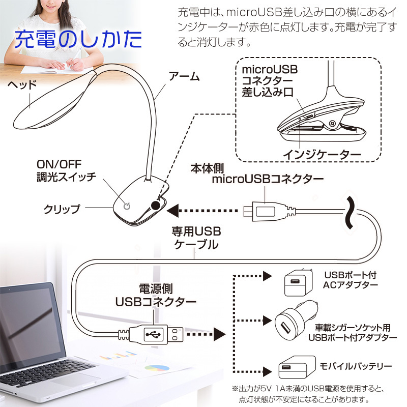 ● USB充電式でコードレスなので、コンセントがない場所でも使用できます