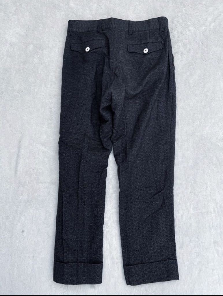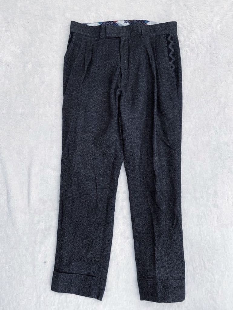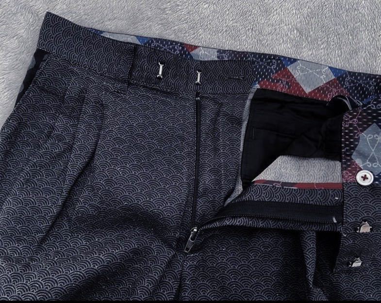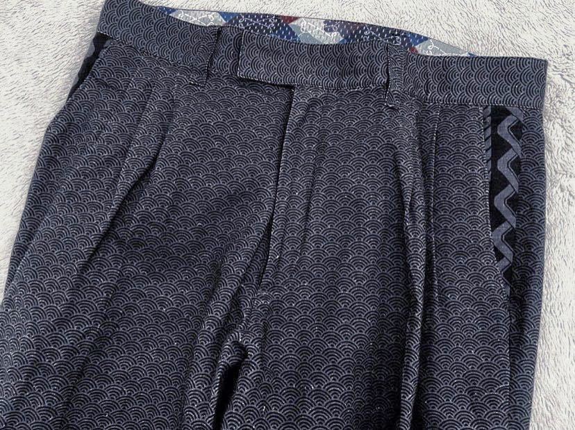 ・和柄のような個性的な生地を使い股上深くタックの立体的でボリュームあるワタリから裾に向かってテーパードした綺麗なシルエットがとてもお洒落なパンツです♪♪