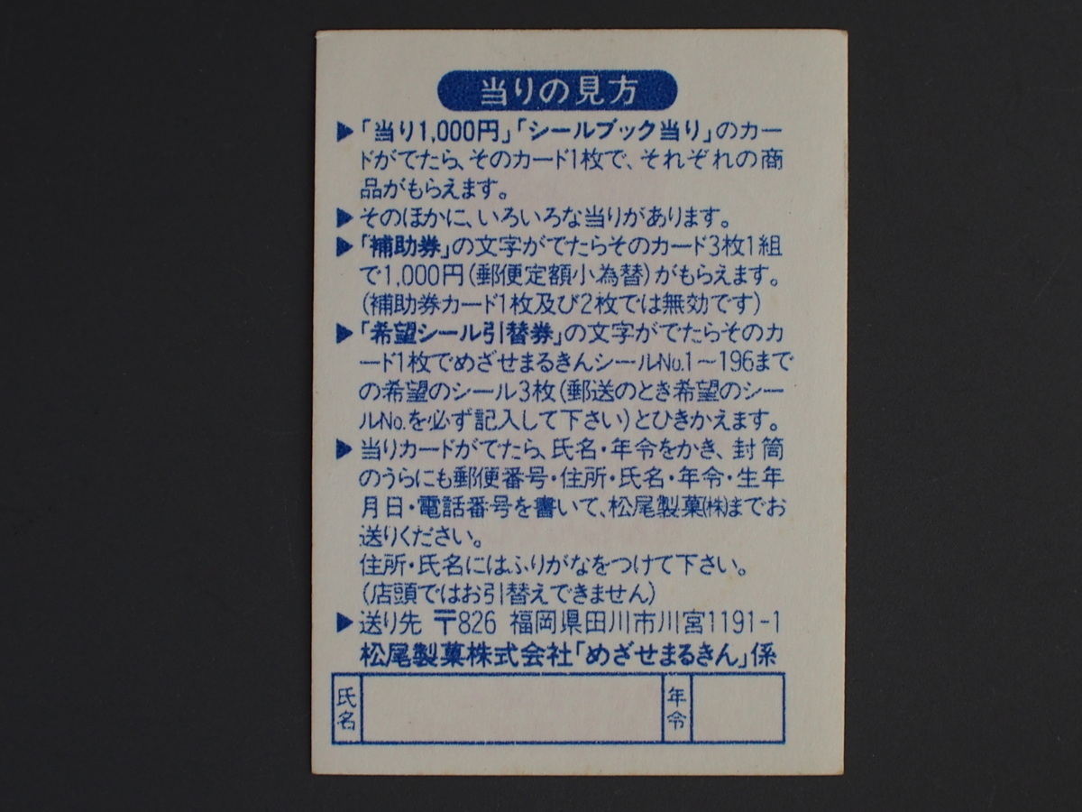 | 商品説明・コメント | 松尾製菓(チロル)、めざせまるきんの「まる字シリーズ」です。 当時、大きい50円型のチョコにオマケシールが付いたビックリマンの二番煎じを狙ったチロルのシールシリーズです。 シールをめくり当たりが出るとお小遣い1000円が貰える大盤振る舞い企画が有った為、真ん中のシール部の剥離が有るかもしれませんが保証範囲外です。 当時の子供たちが少ないお小遣いを工面してこのまるきんで一攫千金を夢見て購入しておりましたが今考えるに子供の宝クジの様な物だったのかもしれません。 アタリが出なかった為、宝くじに匹敵する程の当背率では無いか?、本当にアタリが有るのか?との疑いの声が上がって居た程ですが夢が有ったシールシリーズで有った事は事実です。 大事に保管されていた当時物のシールでは御座いますので年式にしては綺麗かもしれませんがシールに傷、汚れ、痛み、しみ、加工、折れ、劣化は御座いますのでジャンク扱いノークレーム、ノーリターンでの取引を希望致します。 当時物のシールとなりますので現存も少なくなり中々市場に現れる事が無くなって来ましたのでマニア必見です。 商品の仕様の詳しくは御自身でお調べ頂きます様にお願い致します。 古いシールになりますので全てに於いてオリジナルを保証する物では御座いません。 状態に尽きましては写真にて御確認頂けます様御願い致します。 写真では御確認頂けない不具合等もある前提で原則ジャンク扱いにて御考慮下さい。 上記の通り、原則瑕疵担保責任はお受け致しませんので御了承下さいます様御願い致します。 上記の条件を御理解頂けない方の入札はお断り致します。 |
