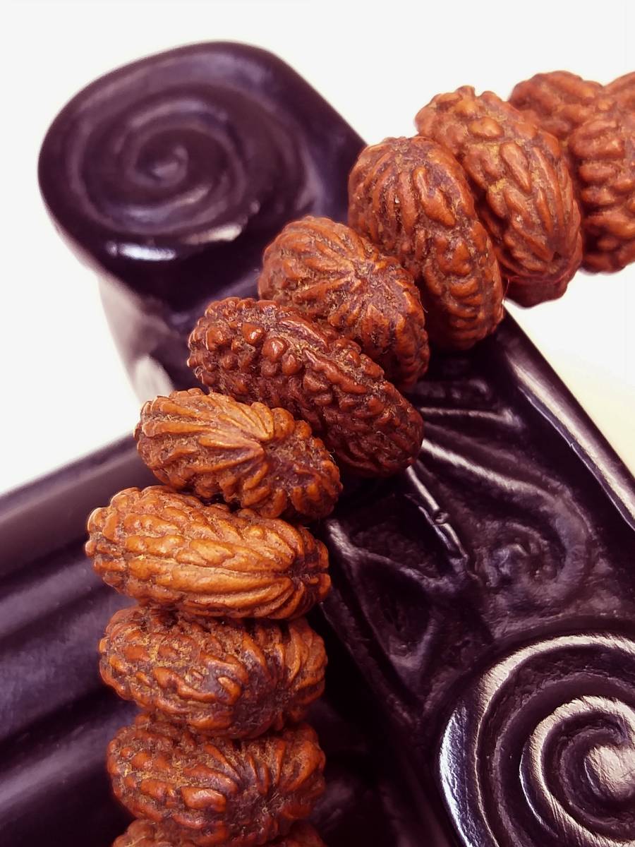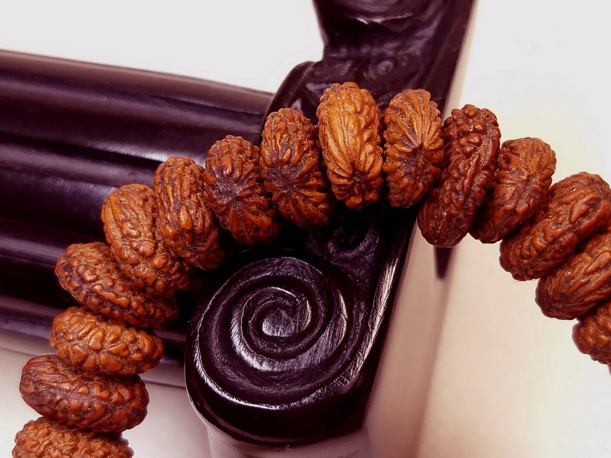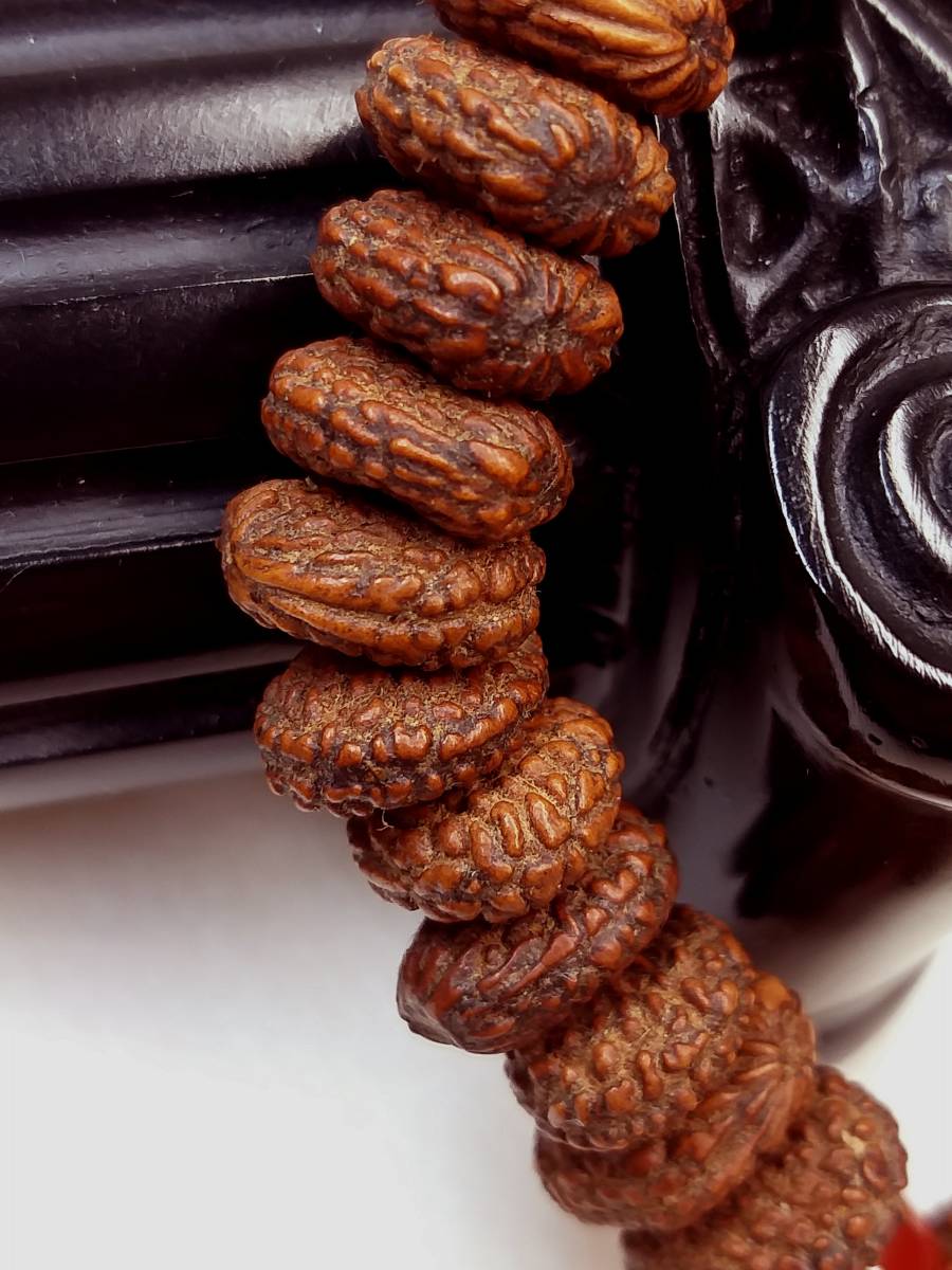 現在出品に使用の天然最高級極珍品野生超大粒インド金禅宝(金銭)菩提(原実老玉)の特徴は:①油性が、非常に良質で、②密度が最も高く、硬度が高く、成長速度が非常に遅くです。”鉄粒”と呼ばれております。石のように硬いです。③色合いが、最極上の純正な赤褐茶です。④重厚感が充分あります。水に入れると沈んでしまいます。⑤木紋紋理は、非常に綺麗です。⑥この腕輪念珠の全ての玉に色の差はありません。
