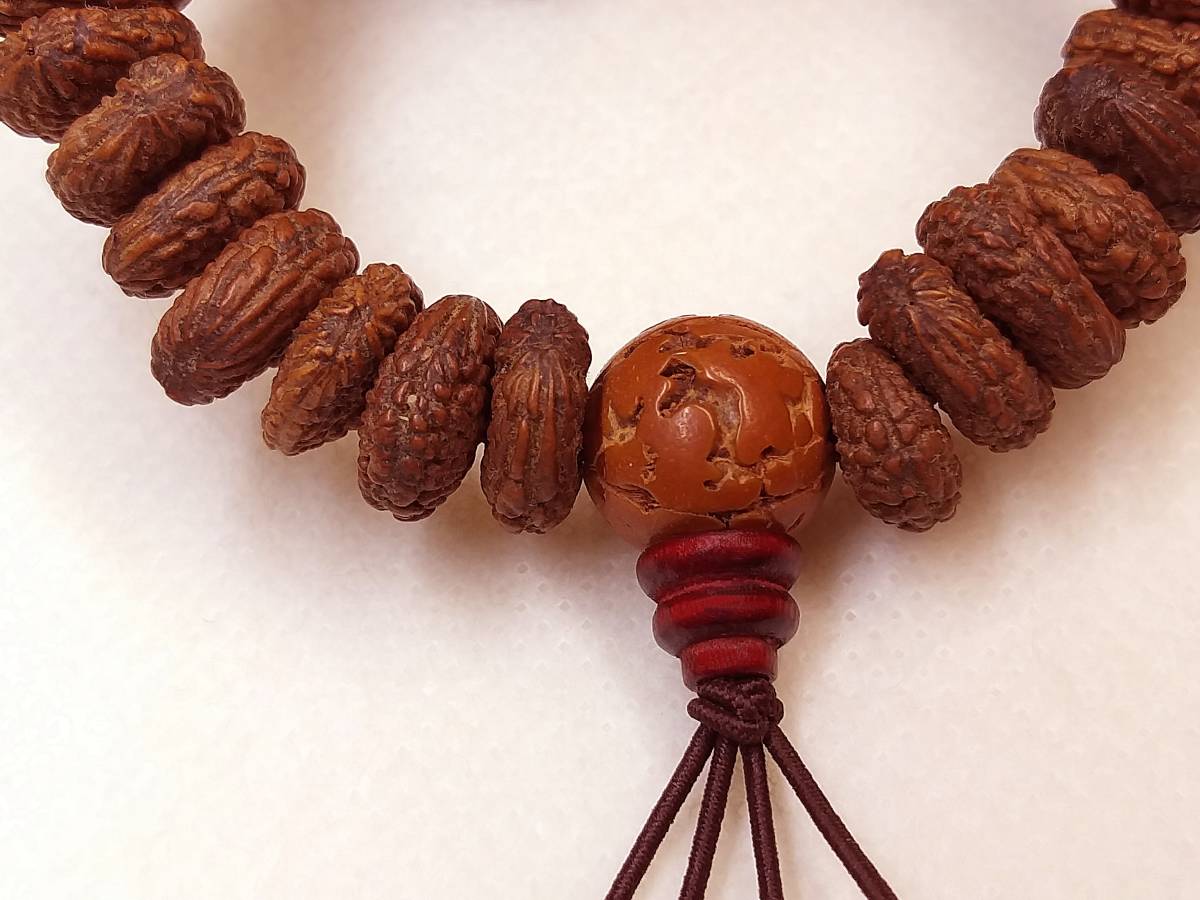 ●商品状態:商品状態は、写真でご覧頂ける状態です。この腕輪念珠の主玉は、当方の収蔵品で、50年の収蔵の時を経て、玉表面の酸化により時代色が深みを帯びている状況と、ほんの少しだけですが汚れが見られます。玉の表面が酸化による変色の状況が見られます。また、擦れた原因から浅い汚れがあります。他の問題は、ありません。この品は、当方の収蔵品です。加工は、非常に精美です。収蔵未使用品です!