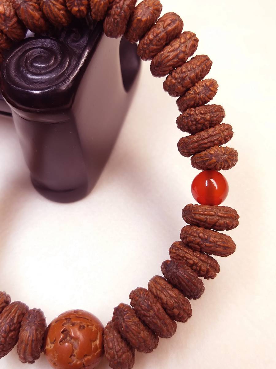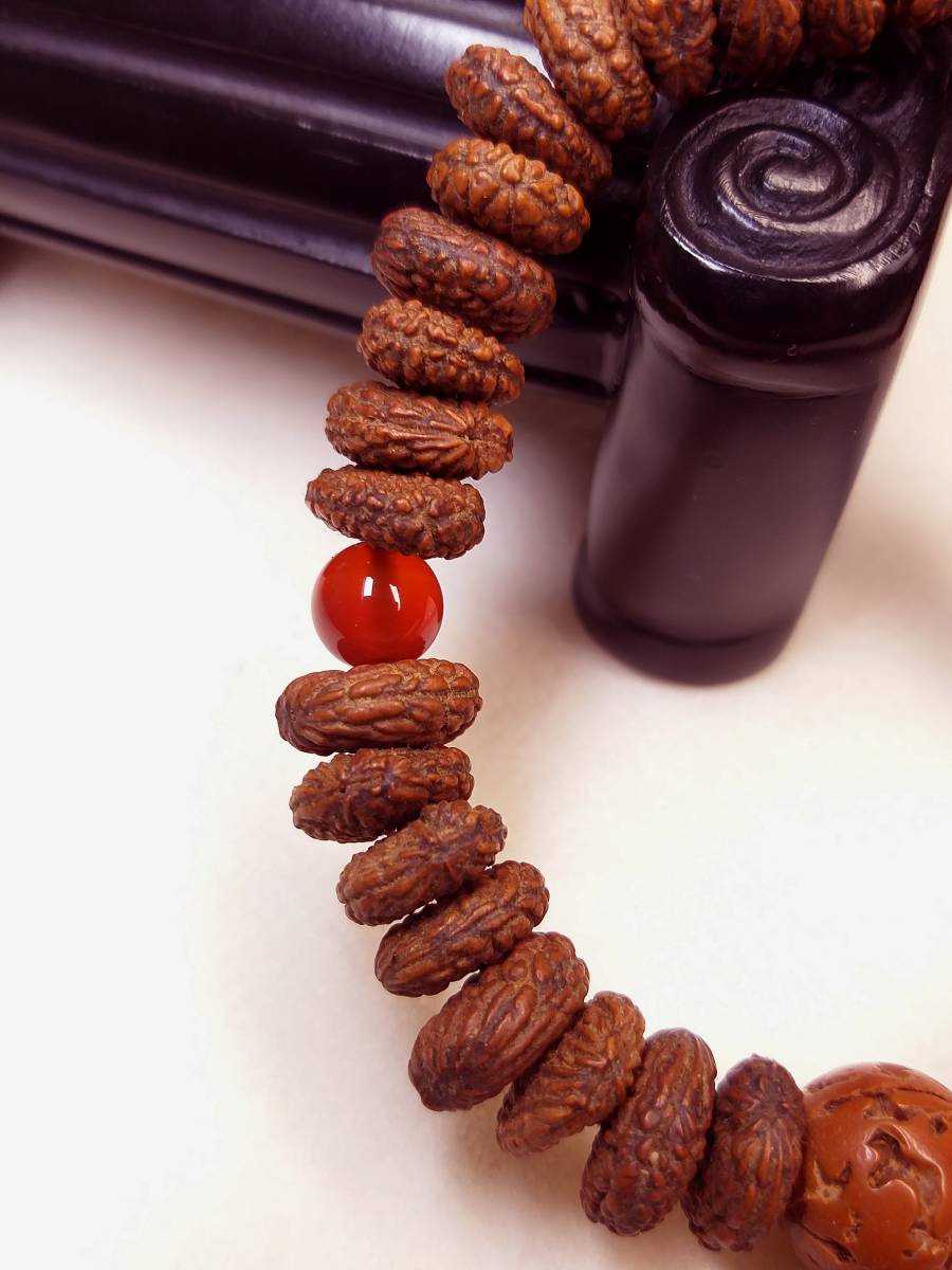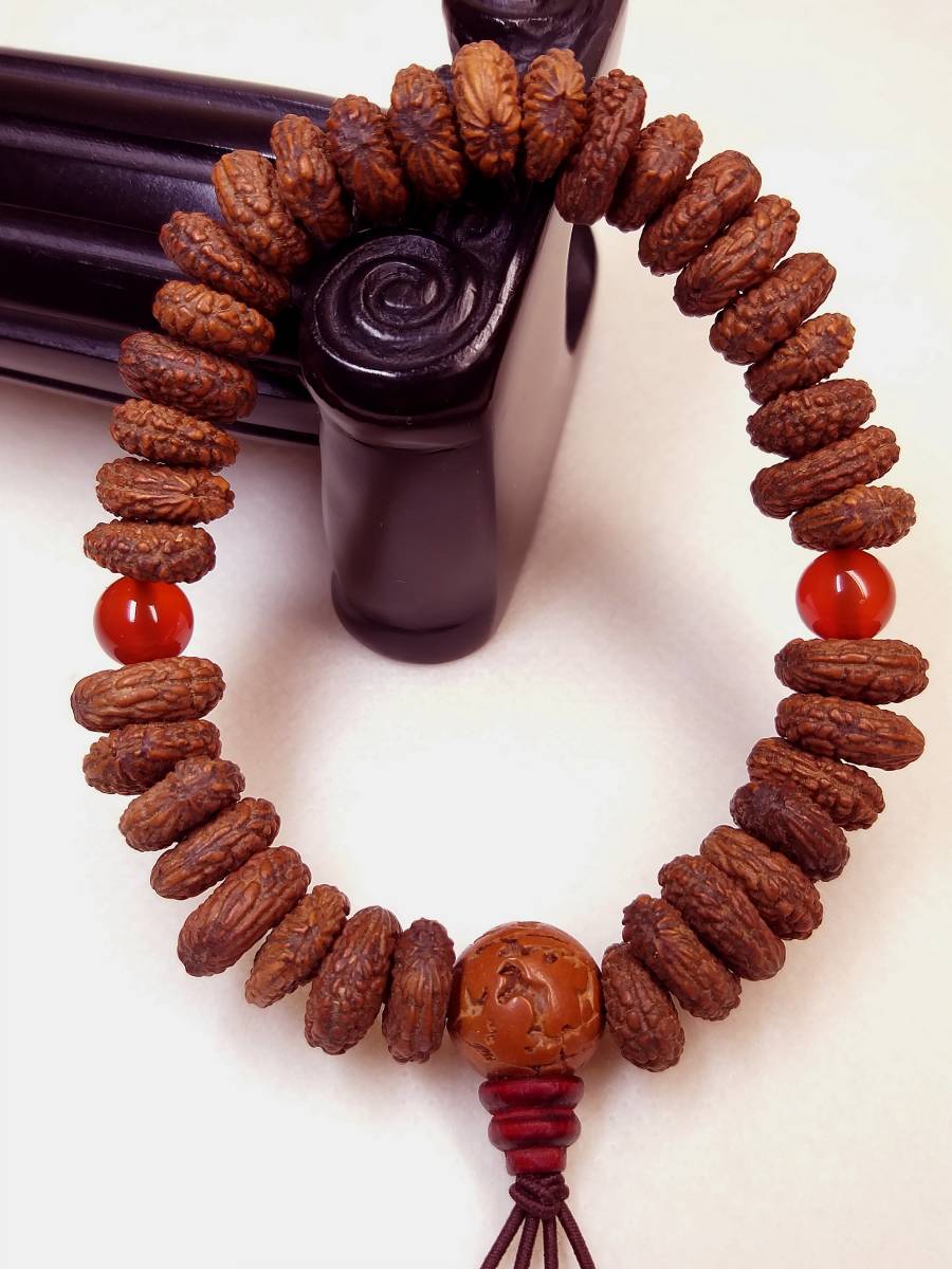 このひとさしの腕輪念珠は、合計41粒(天然最高級極珍品野生超大粒インド金禅宝(金銭)菩提(原実老玉)主玉37玉+天然最高AAA級極品大粒赤瑪瑙二天玉+天然最高級珍品特大粒インド金剛菩提(原実老玉)親玉1玉+天然インド天然野生最高級珍品紫檀ボサ1玉)により構成されています。この種金禅宝菩提の珠は最大でも、このくらいのサイズです。通常は一粒一粒使用します。 この品は、贅沢な天然最高級極珍品野生超大粒インド金禅宝(金銭)菩提(原実老玉)の珠玉による主仕立てになっております。最高級の腕輪念珠です!