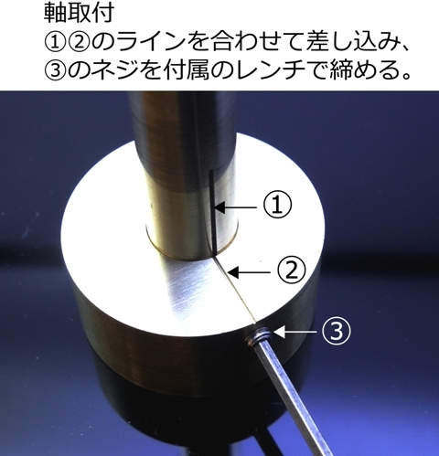 軸と印面の取り付けは、軸抜け防止の為、付属の六角レンチにて印面側面のネジをしっかりと固定して下さい。