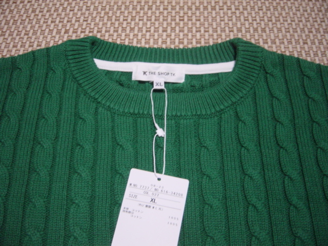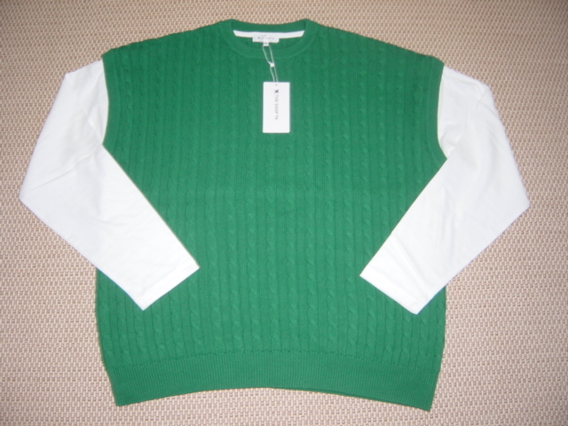 新品未使用のタケオキクチニットベストフェイク長袖シャツです。カラーはグリーン×ホワイト、ケーブルニットと長袖シャツが一体化したユースフルな1品となっています。サイズはXL、丈約70cm 肩幅約61cm 袖丈約59cmです。