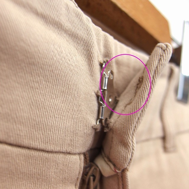【状態】この商品には下記のようなダメージがあります。 ・フックボタンの一部が外れています ・ウエスト部に挟んだような跡 ・ウエスト部右側にほつれ ・ウエスト部右側の下に小さなダメージ ・前身頃の左太もも内側に小さな白い汚れ ※全体的に中古品としての使用感と上記のようなダメージがありますが、通常使用には支障のない商品です。掲載写真や記載内容をご確認いただき、ご理解の上ご購入ください。