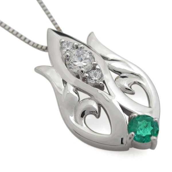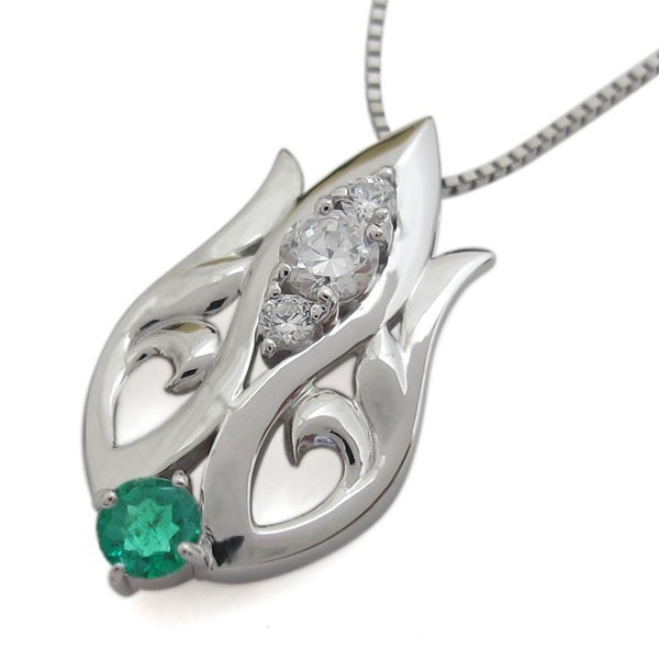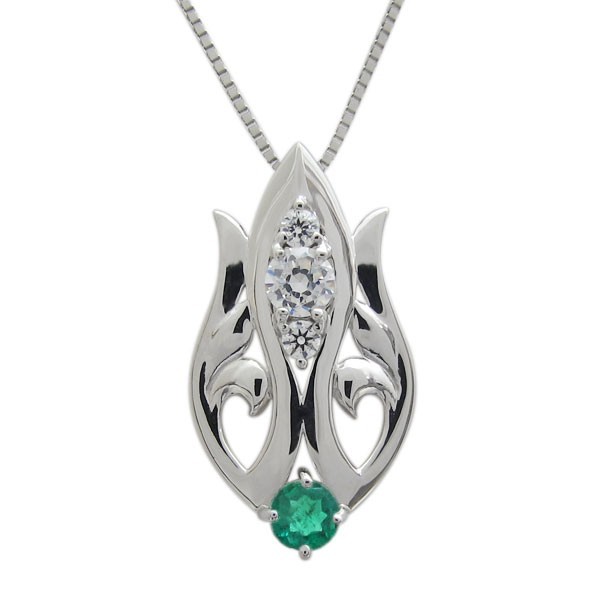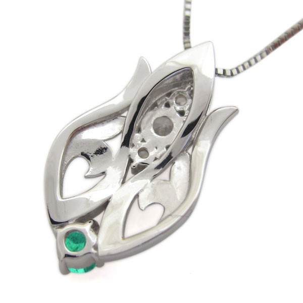 5月誕生石エメラルドを使用したプラチナ製の、羽根(フェザー)モチーフネックレス・ペンダントです。