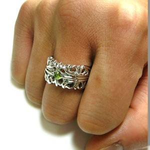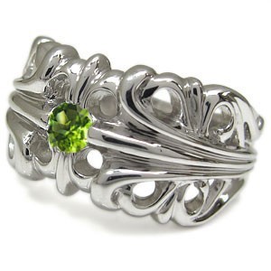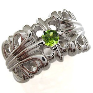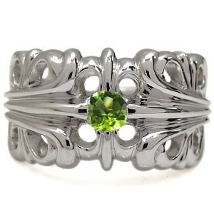 8月誕生石ペリドットを一粒使用したクロス・百合の紋章デザインの18金製リングです。