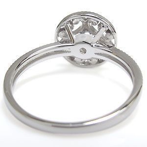 中央の天然石を囲むような繊細な透かし模様に、散りばめられたダイヤモンドや全体にミル打ちを施したデザインは、優雅でアンティークな雰囲気が漂います。
