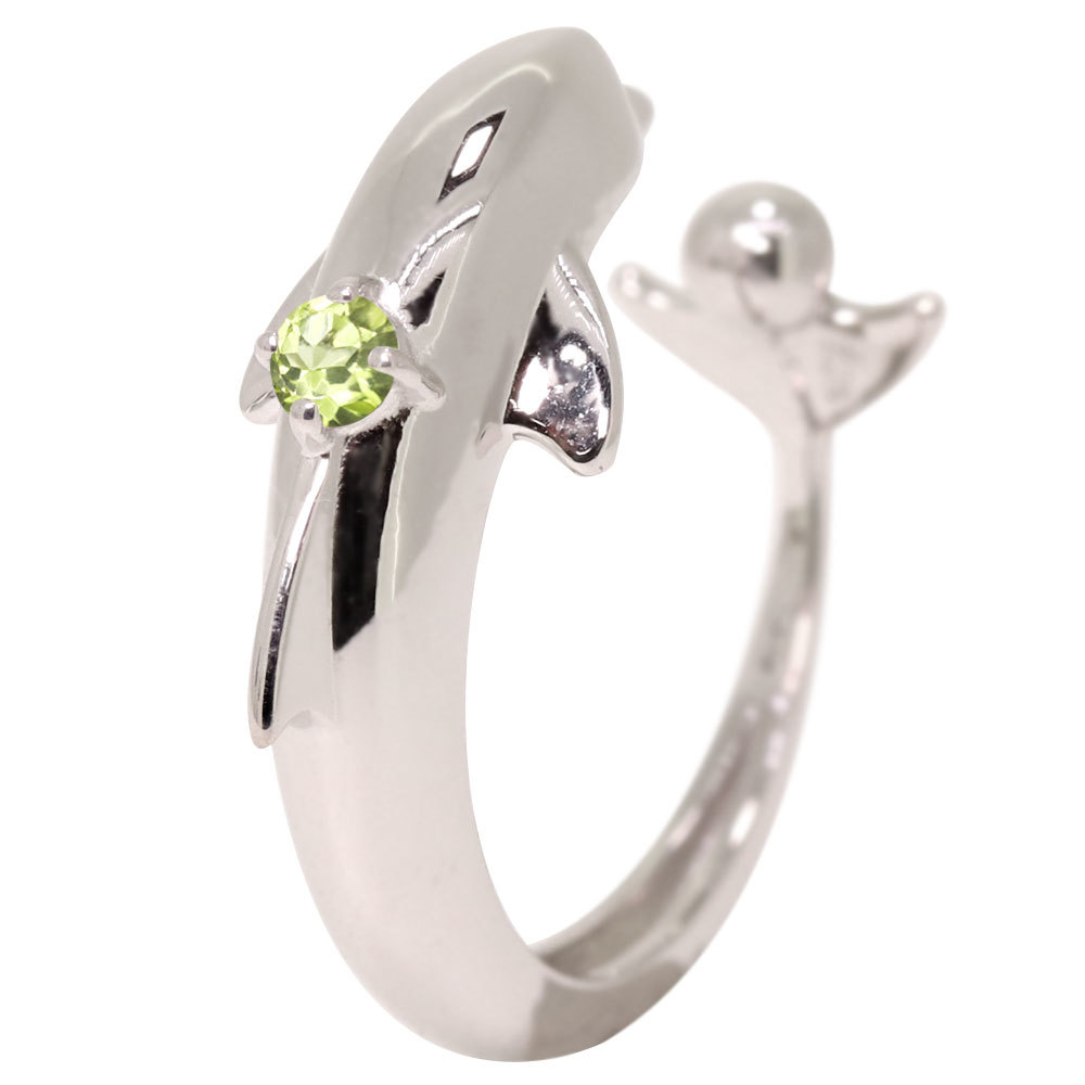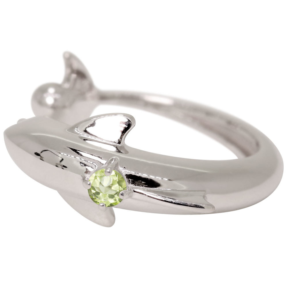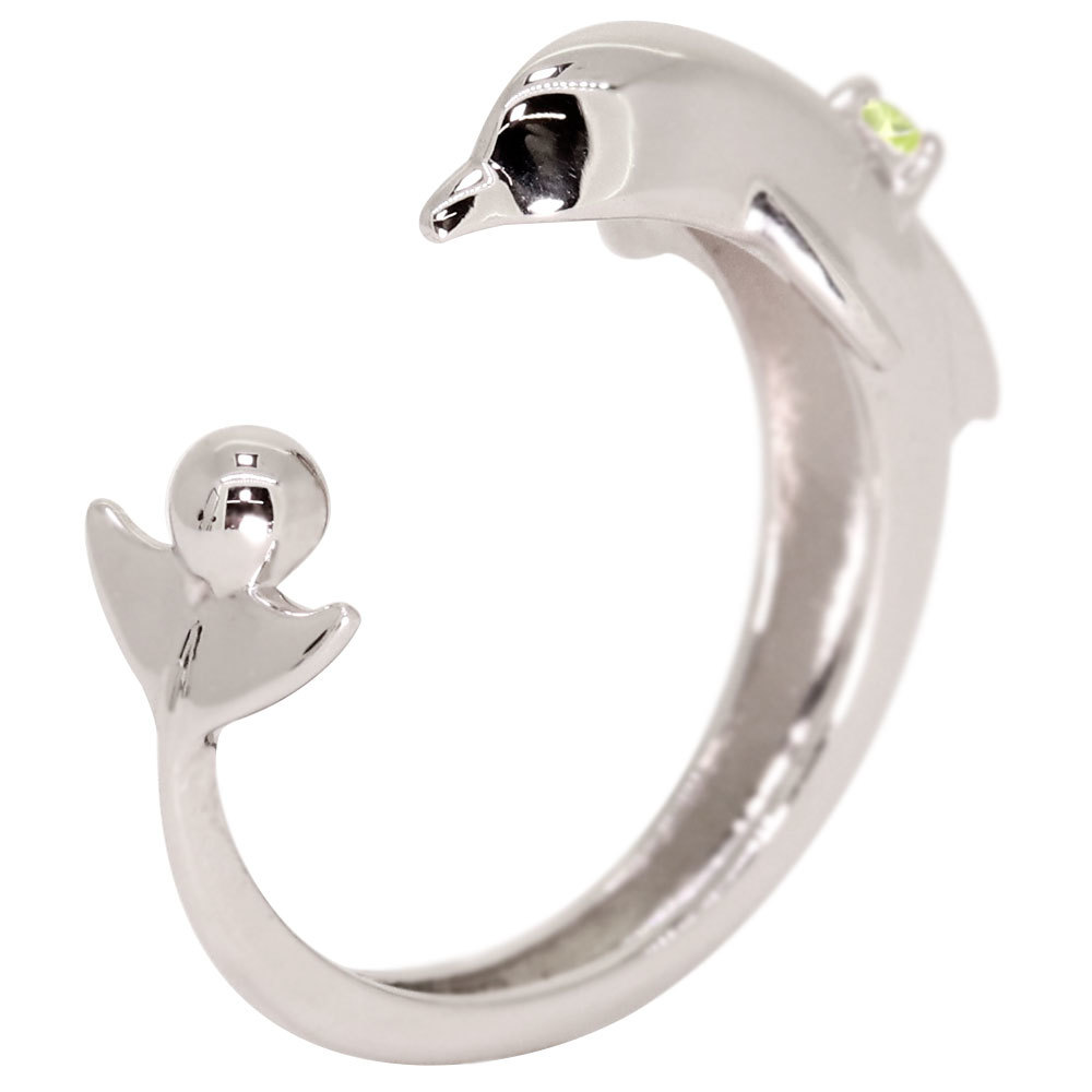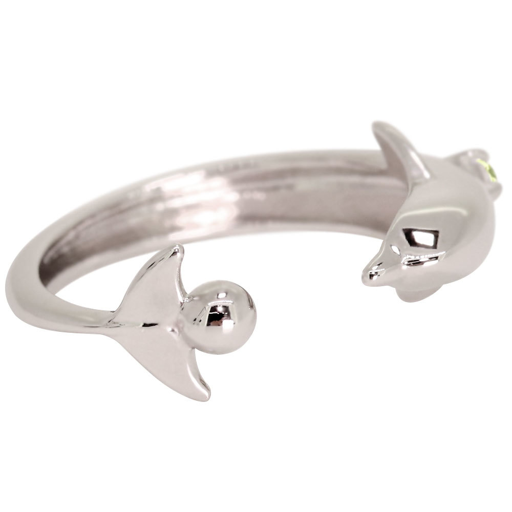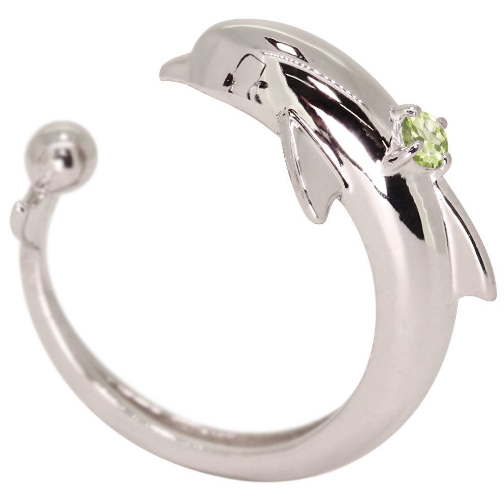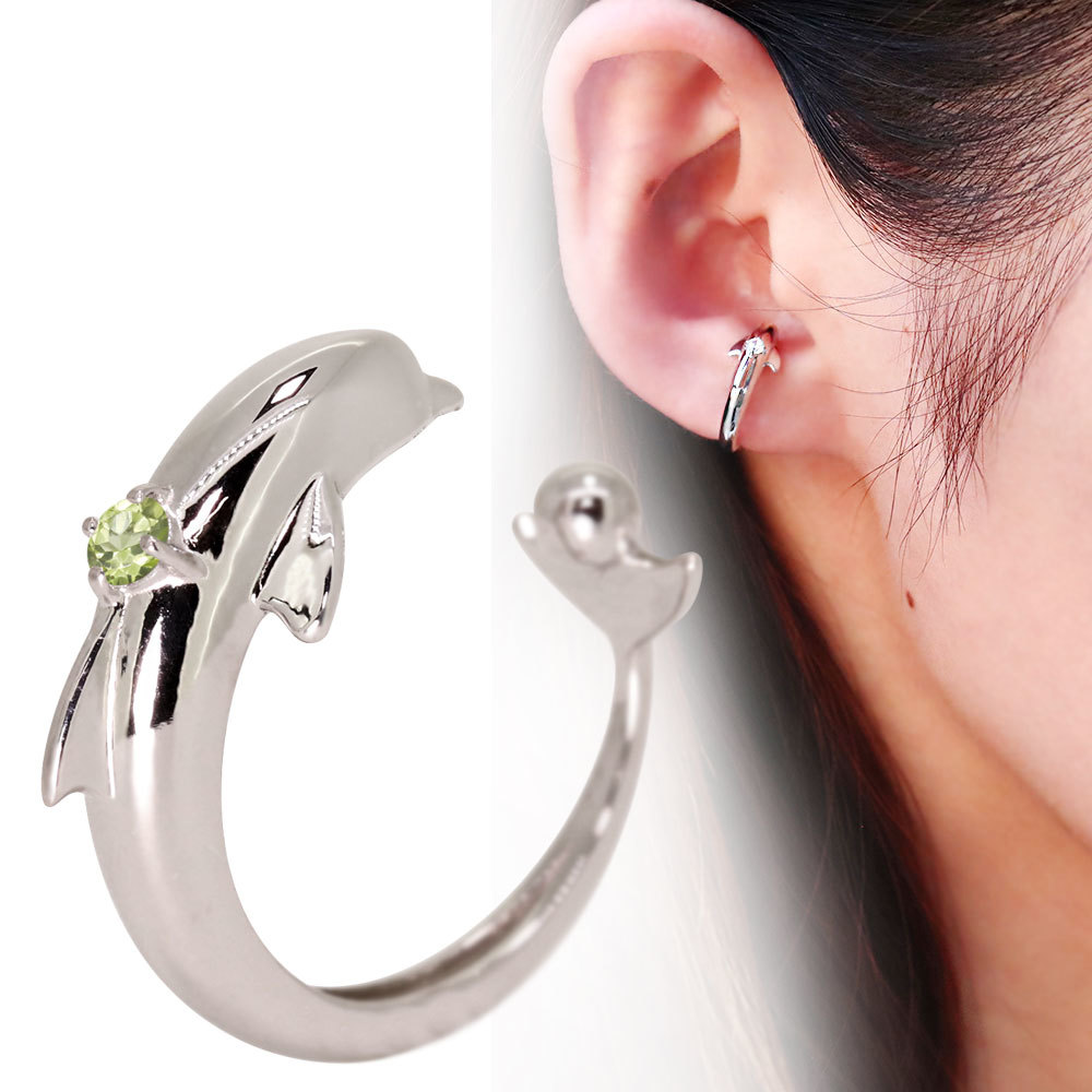 8月誕生石ペリドットを使用したプラチナ製の、イルカ(ドルフィン)モチーフのイヤーカフです。