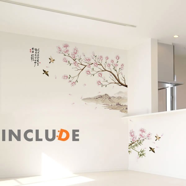 ウォールステッカー 春 春眠 春の訪れ 鶯 ウグイス うぐいす メジロ モクレン 木蓮 花 山 山の重なり 水彩画 フラワー 綺