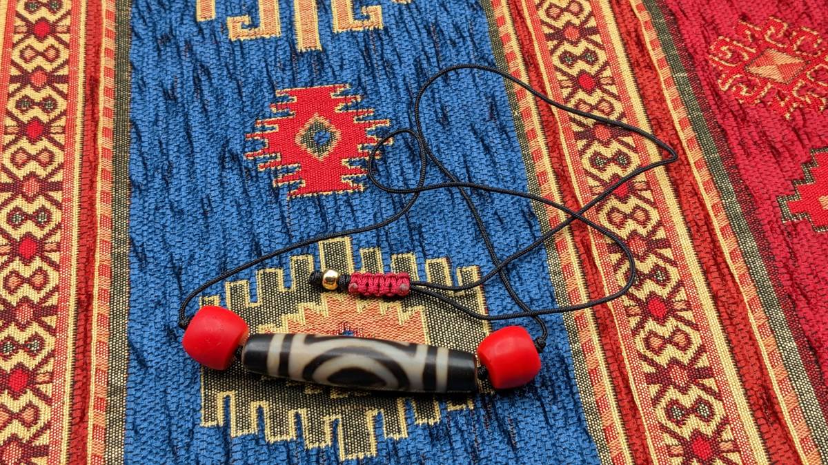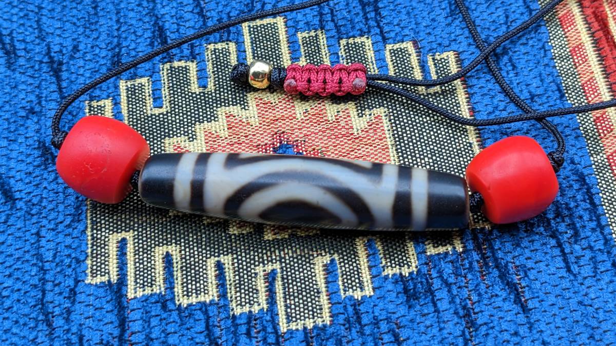 アンティークのシェルパコーラル(と呼ばれる赤いガラスのビーズ)を天珠の両サイドに使いチベタンスタイルのネックレスにしてみました。