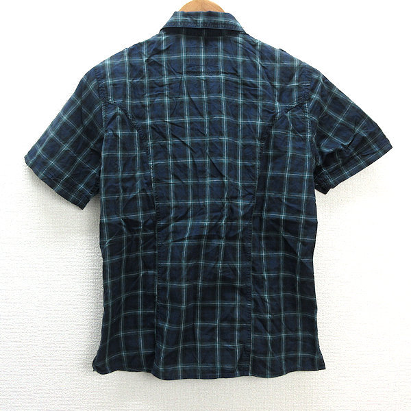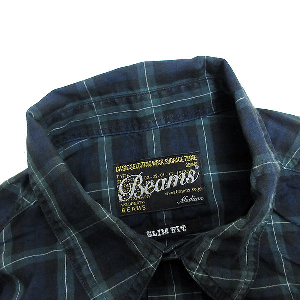 s■ビームス/BEAMS チェック柄 エポレット付き 半袖シャツ【M】緑 紺/MENS/99【中古】