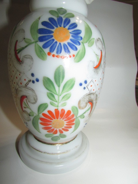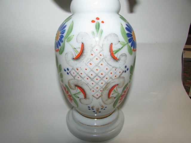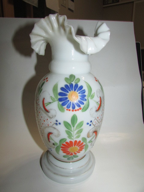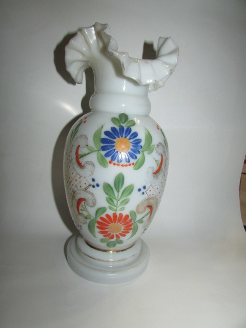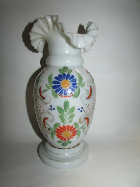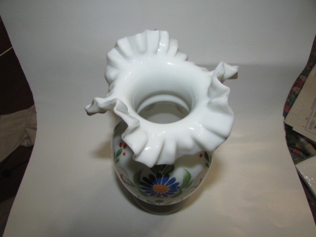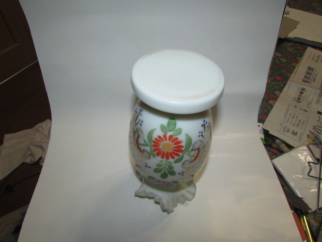 ( 会津若松市・旧家・蔵出し)( 古い時代の乳白色ガラス・手描き花模様フリル飾壺 )・貴重・珍品