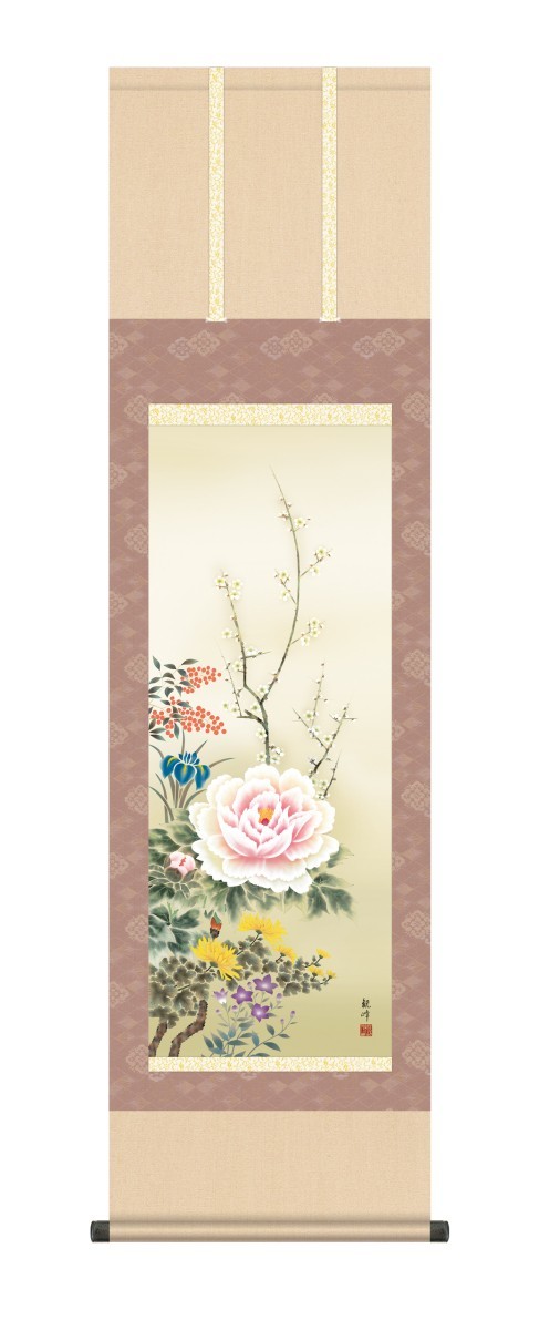 掛け軸 高精細巧芸画 純国産掛け軸 花鳥画 山村 観峰 「四季花」 尺三 オニックス風鎮 防虫香サービス