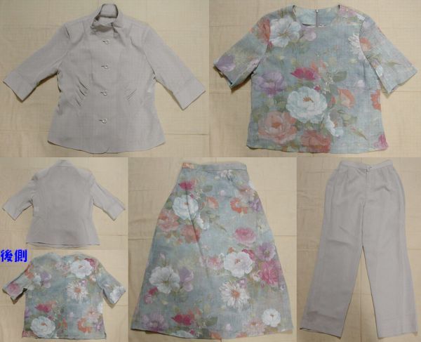 表示サイズ:11AR(B86、H93、T158、W67) 素人平置き採寸:[ジャケット]身幅50、着丈61、肩幅39、袖丈39 [ブラウス]身幅49、着丈54、肩幅39、袖丈27 [スカート]ウエスト33.5、丈81 [パンツ]ウエスト33.5、丈94、股下68