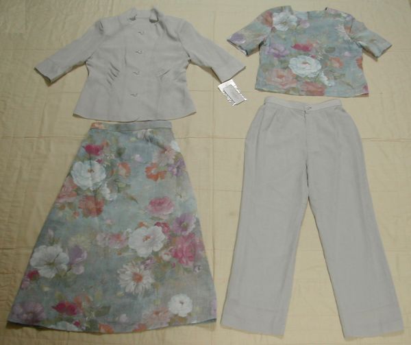 薄手で涼しげな素材の七分袖ジャケット、半袖ブラウス、スカート、パンツの4Pスーツです。