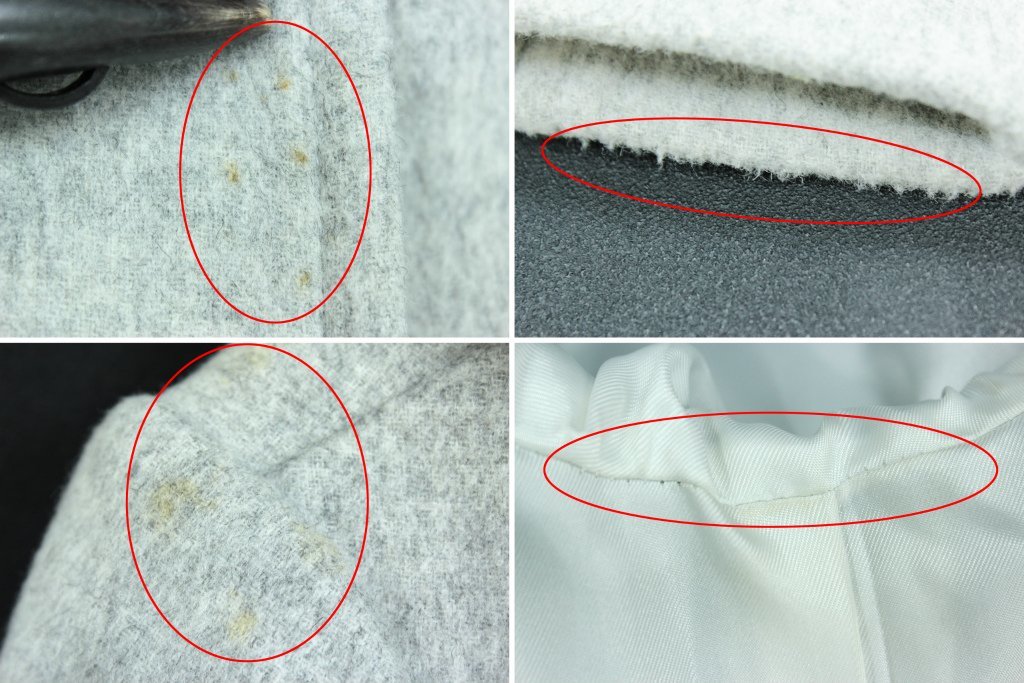 ・前中央、右フード、右肩など全体に最大約1.5cmのシミ(画像9枚目左上下)