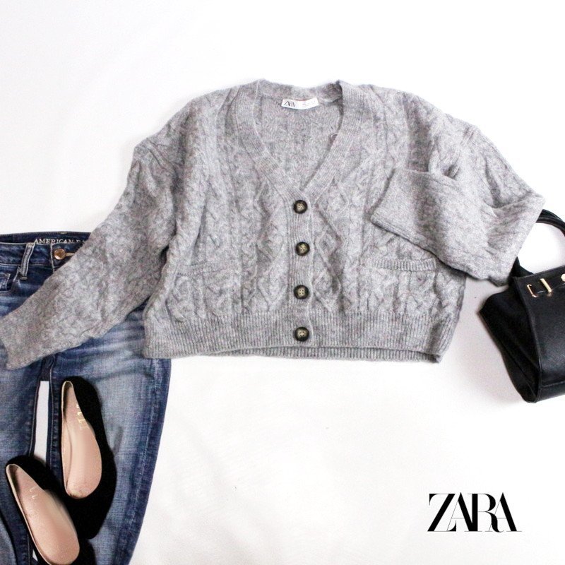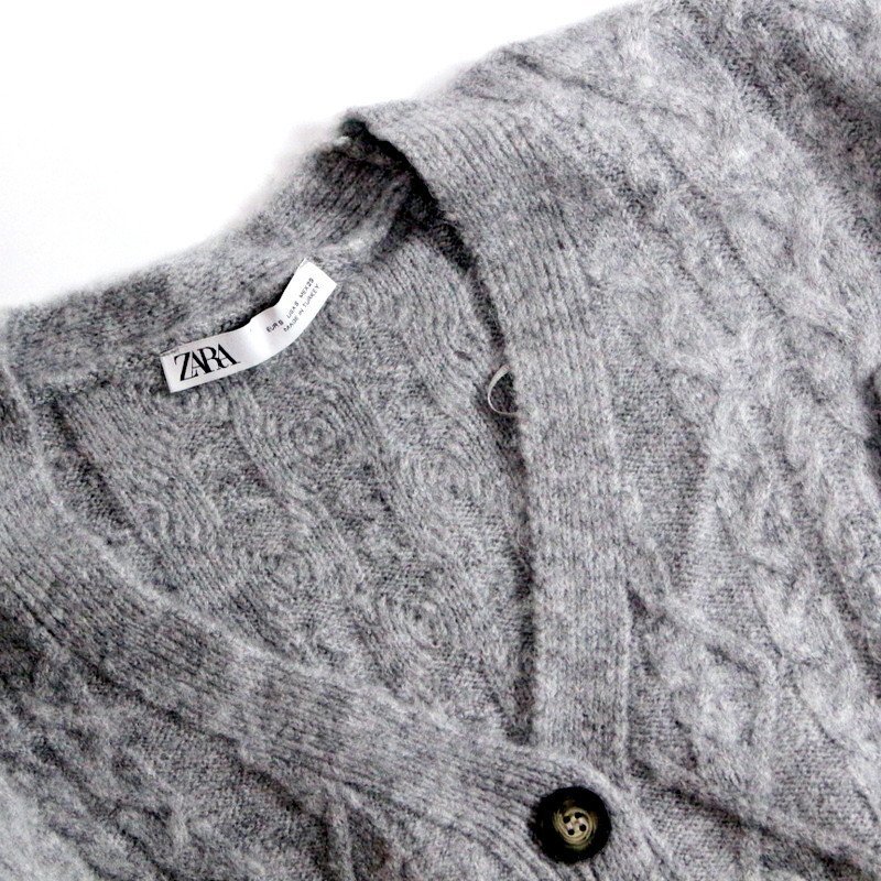 美品 厚手 ZARA ザラ ■ 冬 あったか ドロップショルダー 立体 ケーブル編み ニットカーディガン グレー S