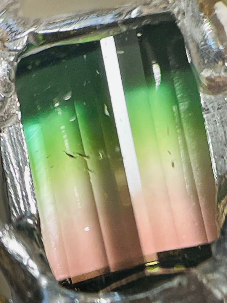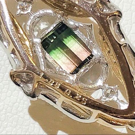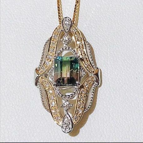 こちらは、K18ベネチアン柄チェーンにK18PG/WG台にパートカラードトルマリン1石、ダイヤ34石付きペンダントネックレスです。