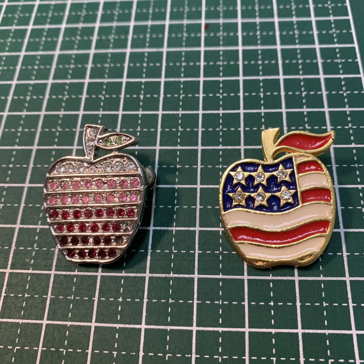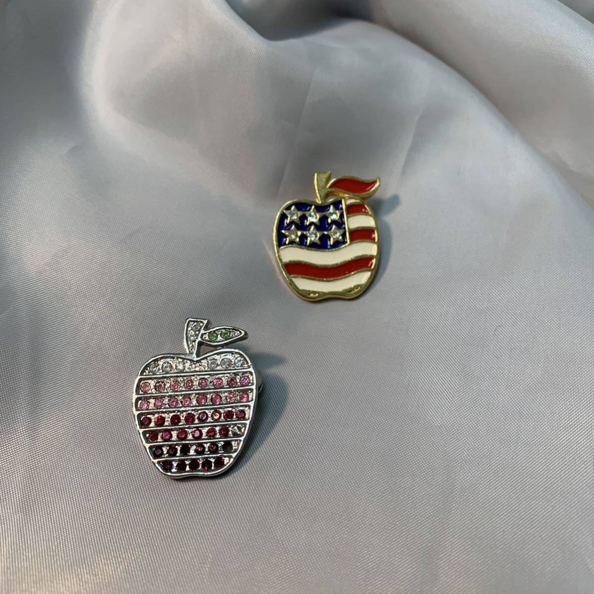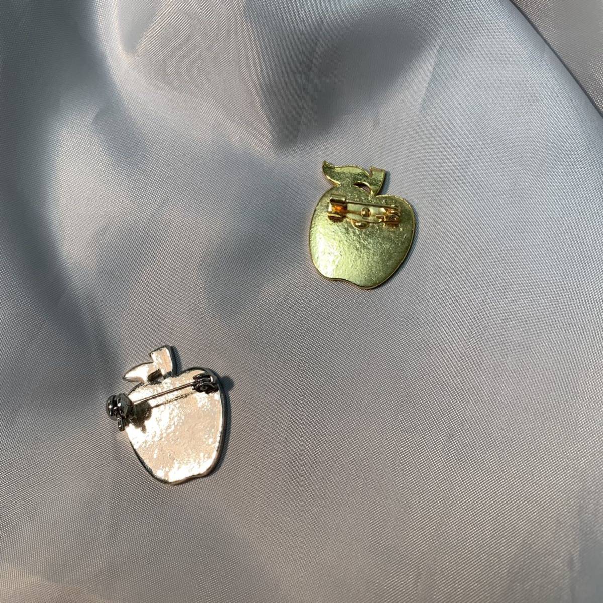 アップル りんご ラインストーンブローチ2個セット/ゴールドカラー&シルバーカラー