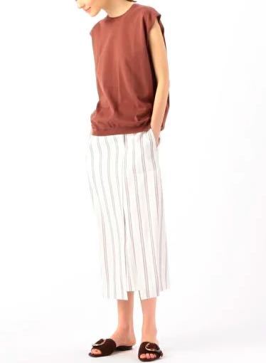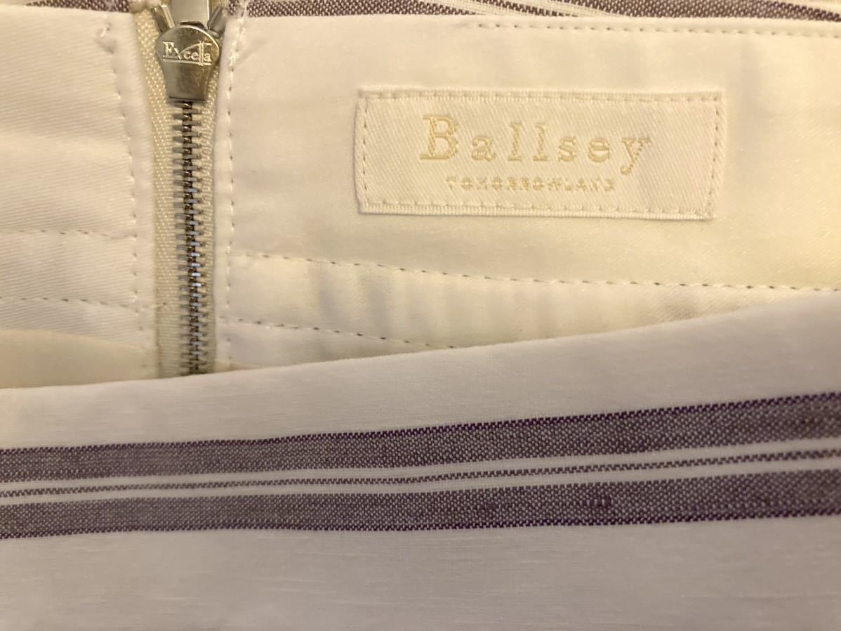 ボールジーのリネン素材の伸縮性のあるスカート。上質なリネンとレーヨンを掛け合わせたハイブリット素材で、さらりとした清涼感のあるタッチと控えめな光沢・優れたストレッチ性が魅力です。白地にライトパープルの春夏らしい爽やかなストライプ柄。スッキリとしたI ラインにラップ調のフロントデザインがアクセント。オフィスシーンはもちろん、Tシャツやフラットサンダルを合わせた抜け感のあるスタイルにも素敵。未使用保管品。