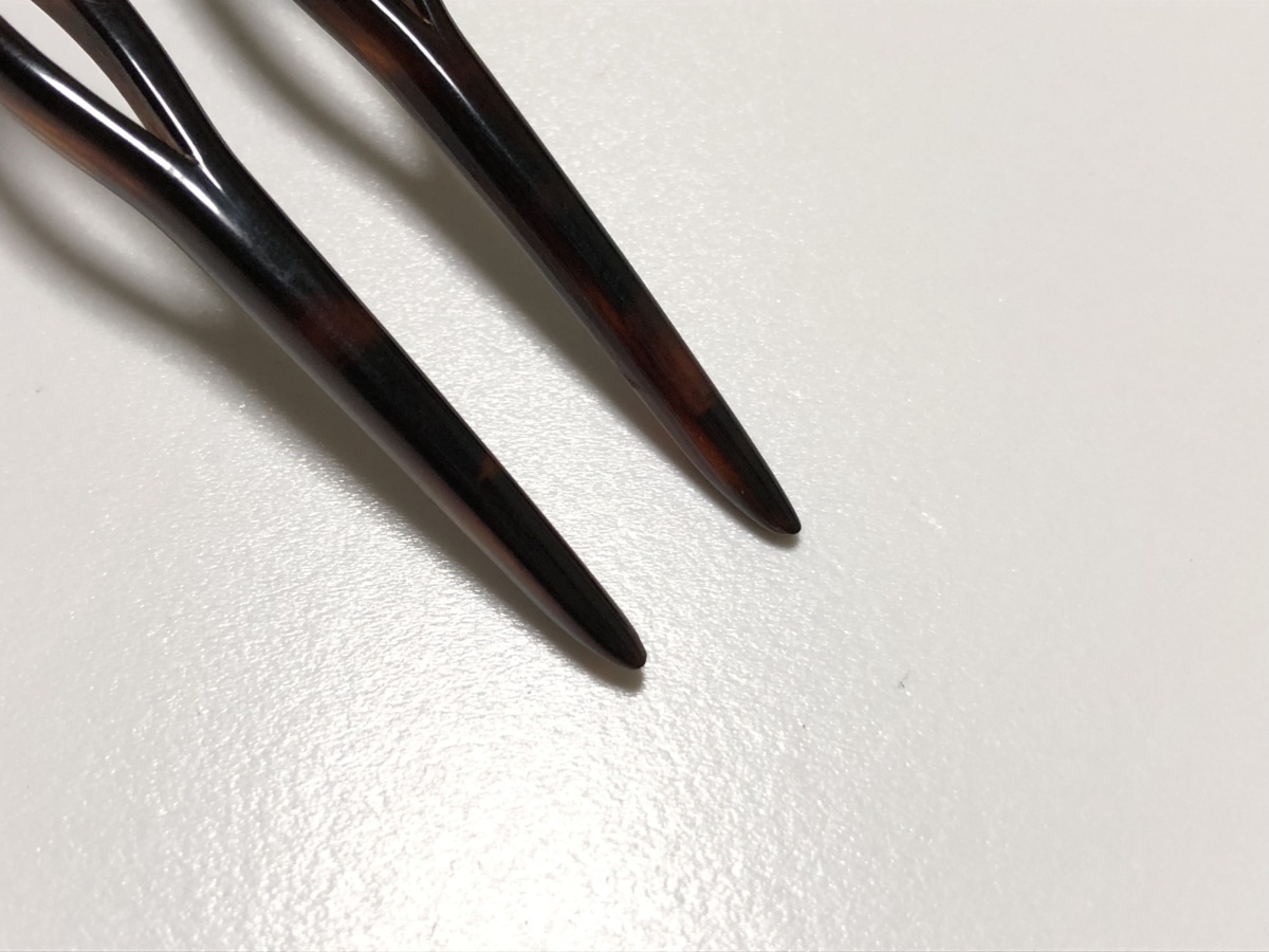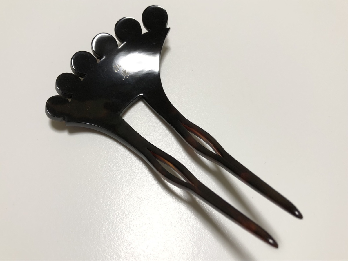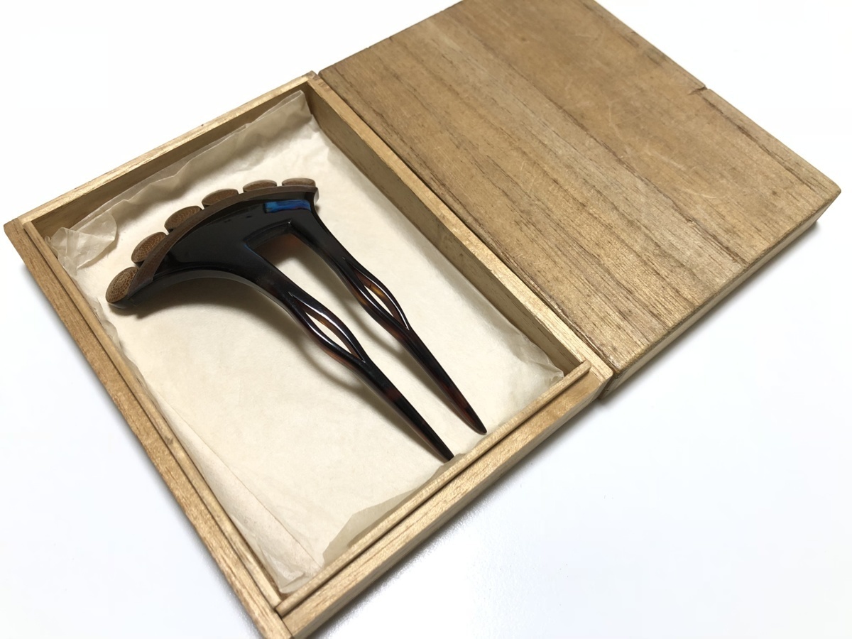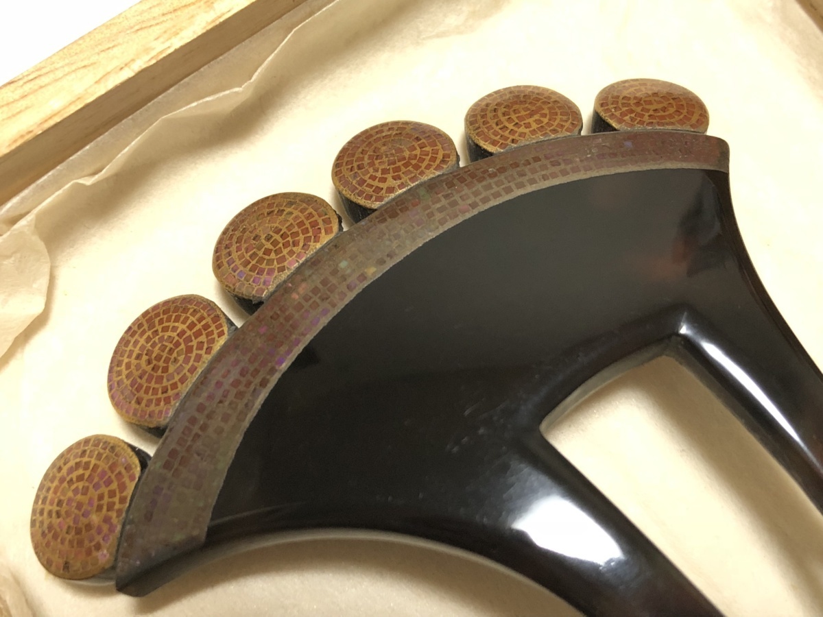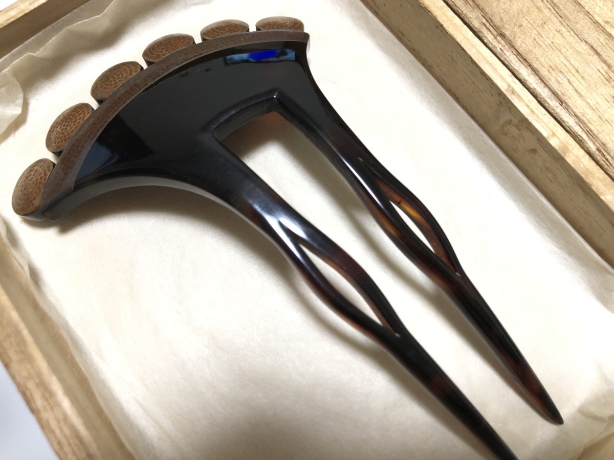 アンティークの黒甲の本鼈甲を使用し、金蒔絵、螺鈿を施した、小ぶりのデザイン扇簪です。鼈甲部分に欠けや虫食いは無く、状態良好です。共箱付属です。 長さ10.0㎝、幅6.3㎝、重さ10.0g