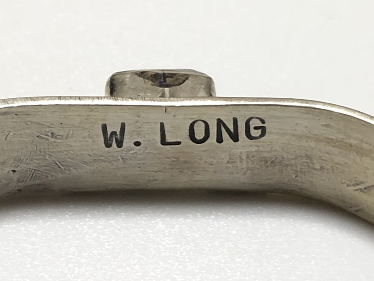インディアンジュエリーのターコイズ、シェル(白蝶貝)、レッドコーラル(赤珊瑚)、SILVERを使用した、インレイデザインのバングルです。作者、W.LONGの刻印があります。金属面にSILVERの刻印はありませんが、SILVER保証です。 内径 縦4.3㎝、横5.8㎝、幅1.0㎝、重さ15.3g インレイ部分 縦横8㎜