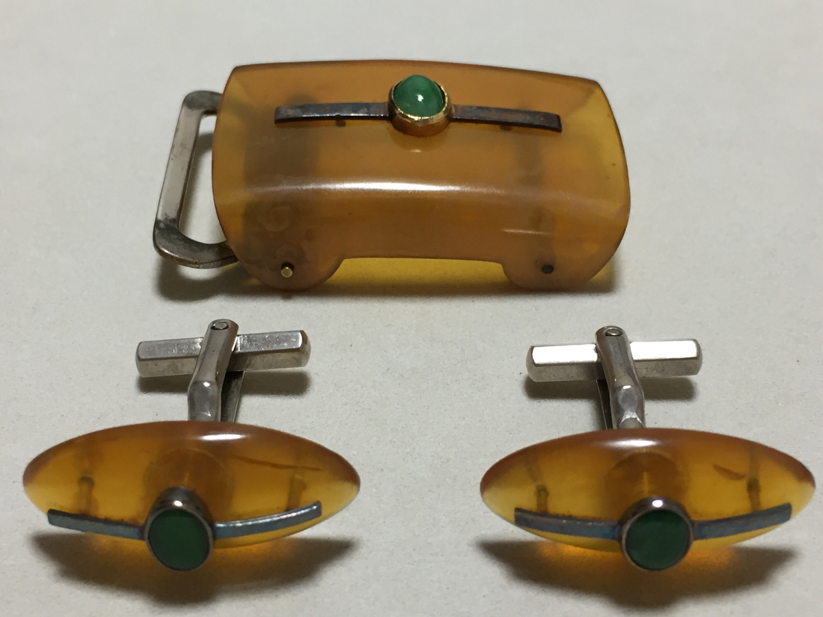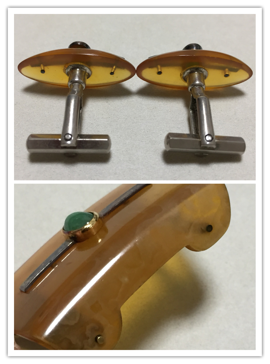 アンティークの白甲の本鼈甲、本翡翠、K18を使用した、デザインバックルです。K18はバックルの本翡翠の周りのみ使用されておりますが、刻印はありません。鼈甲部分に欠けや虫喰いはありません。バックルの片方の側面に変色があります。金具部分に、サビ、くすみがあります。 バックル 縦3.0cm、横5.0cm、重さ13.9g カフス (縦1.2cm、横2.75cm、重さ4.9g)×2