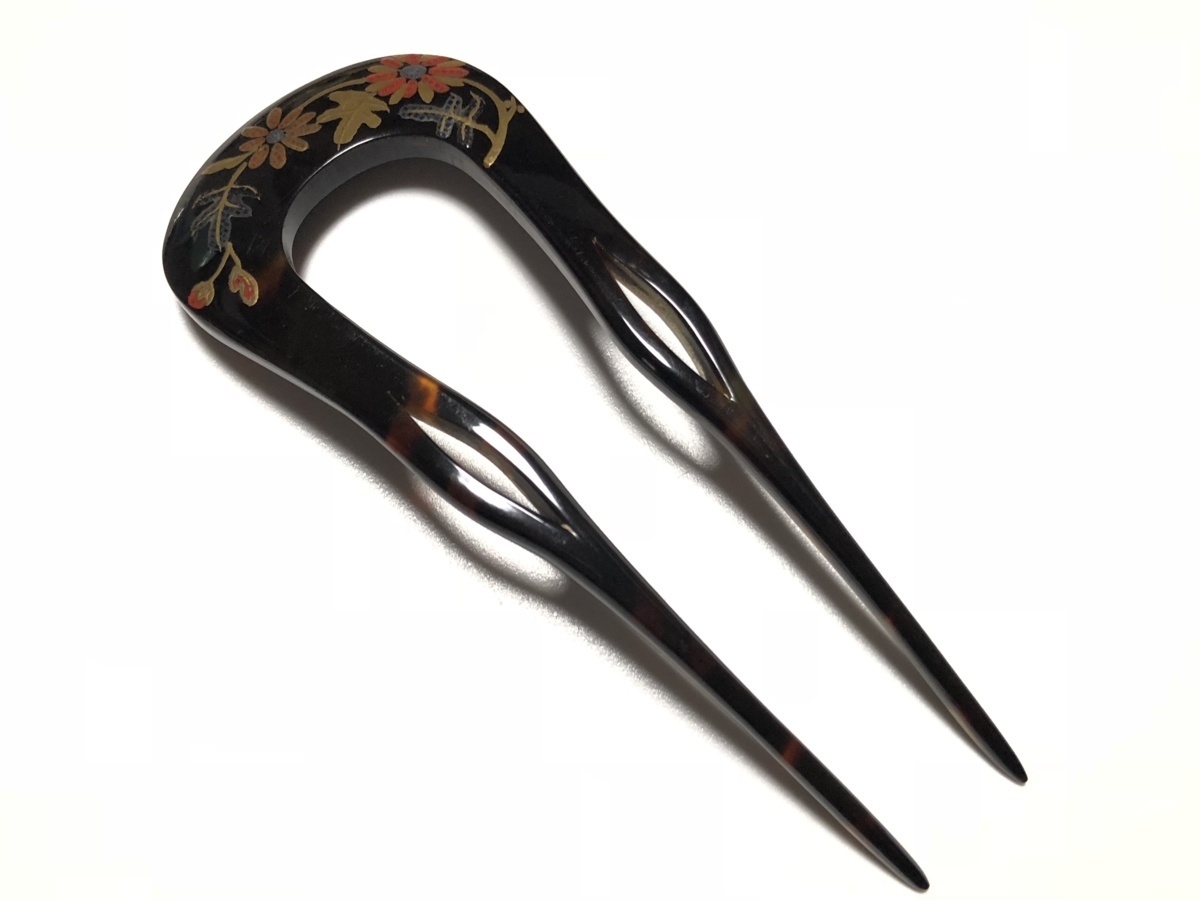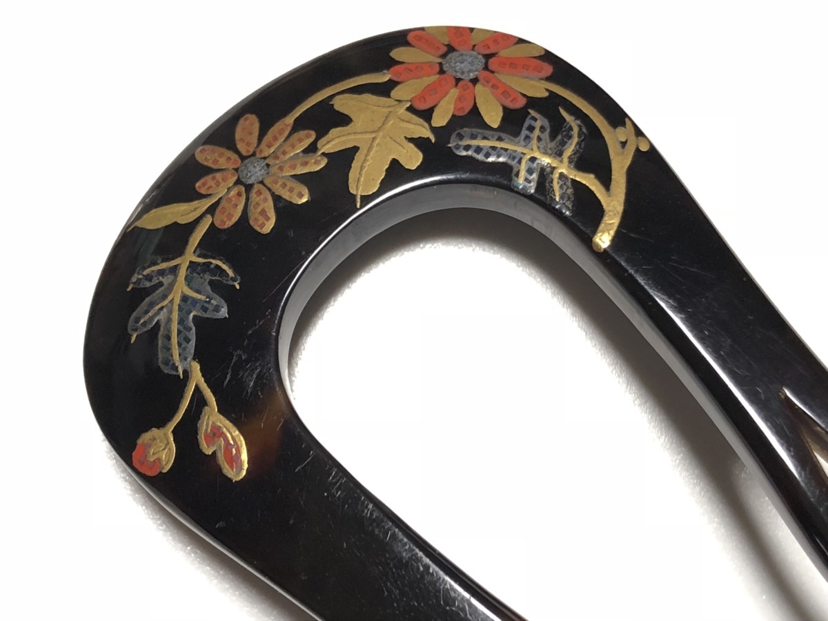アンティークの本鼈甲を使用し、金蒔絵、螺鈿を施した、花文の簪です。作者、永山の銘があります。鼈甲部分に欠けや虫食いはありません。小キズがあります。 長さ12.4㎝、幅4.8㎝、重さ10.3g