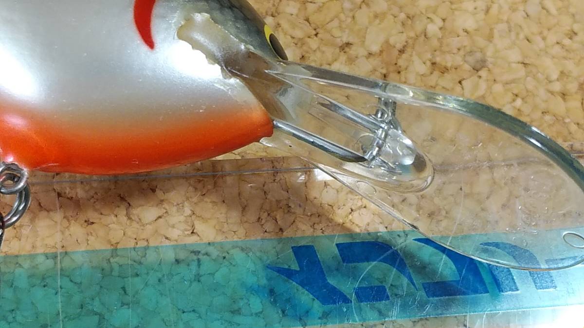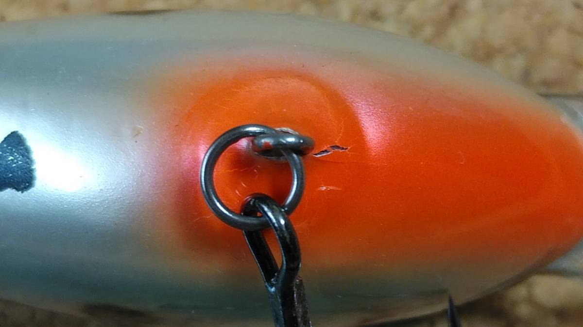 程度;使用やコレクション用に集めたもので、現在はコレクションになっていてるものです。相当年数が経過していますので、経年劣化(写真の様に経年劣化で鉛のおもりが膨張{飛び出して}?してフロントフックのアイ部にクラック(ヒビ)が出ています。また、リップ・アイの部分に縦に走るヒビがあります)、他は使用、ボックス保管に伴う傷、汚れが多少みられますが2つにのヒビ以外は年数の割に綺麗です。