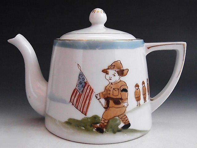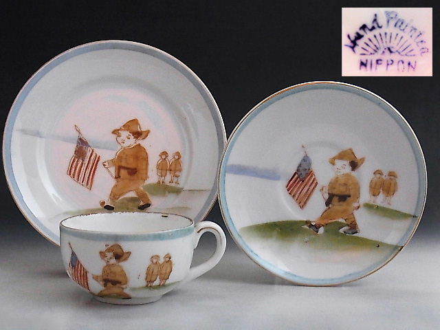 オールドノリタケのままごとセットです。 ゲートルを巻いた子供の兵隊さんがアメリカ星条旗を捧げ持った絵がひとつひとつ手描きされた、カップ&ソーサーにケーキ皿2組、シュガー&クリーマー、ティーポットのセット作品です。 昔の子供たちはある意味贅沢だったことが垣間見られます。 状態は絵に極小の擦れがある以外ほぼ完全美品です。 大きさは例としてカップの直径が5.6cm、縁からの高さが3.2cm、ソーサーの直径が9.5cm、ケーキ皿の直径が10.8cm あります。 年代は大正元年頃の作品です。 送料は2800円頂きます。 お支払いはYahoo!かんたん決済、または銀行振込みでお願いします。 日本以外への海外発送も承ります。 ご入金確認後支払2日以内にアメリカより航空便でお送りいたします。 発送後通常4~10日でお届けいたします。 複数品落札の場合は送料をまとめて計算させて頂きますのでお得になります。 私共は経済産業省の定める特定商取引法を順守しております。 当方の所在地住所等は出品者の自己紹介情報欄をご覧ください。 ご質問等ございましたらお気軽にお問い合わせください。   他にもオールドノリタケを中心に沢山出品しておりますのでここをクリックしてご覧ください。