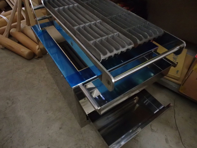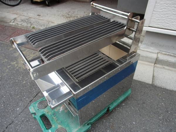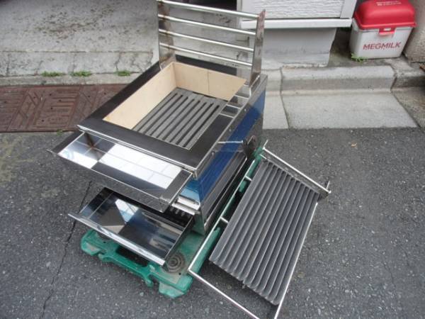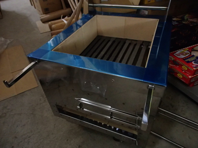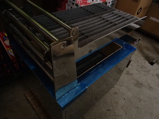 炭入れ内寸約282×353×深さ100mm 食材焼面 間口250×奥行き440mm ステーキグリルバー2枚タイプ(約120×440mm ×2枚) ステーキグリルバーの材質 鉄鋳物 空気窓 1か所 ステンレス製灰受け、ステンレス製油受け付き 炭火床は、耐火レンガ焼物器なのでとても丈夫です。外側は、ステンレス製で衛生的です。内側 耐火煉瓦 ステーキグリルバーは、取り外しが出来ます。(ステーキグリルバーのステーは、外せません。溶接で取り付けてあります。) ステーキグリルバーを上に上げると炭の補充が、簡単に出来ます。 重さは、ハカリが無いのでわかりませんが、50kg~70kgくらいあると思います。しっかりした作業台に乗せてご使用ください。 サイズは、メジャーではかりましたが、数ミリずれてる場合があります。おおよそです。 ~~~~~~~~~~~~~~~~~~~ |