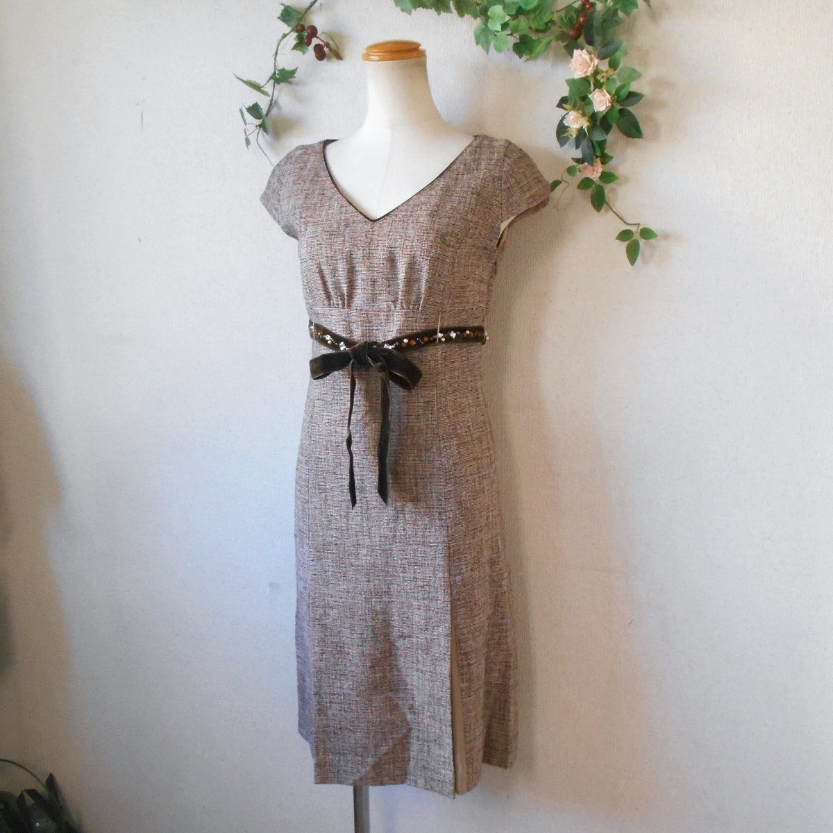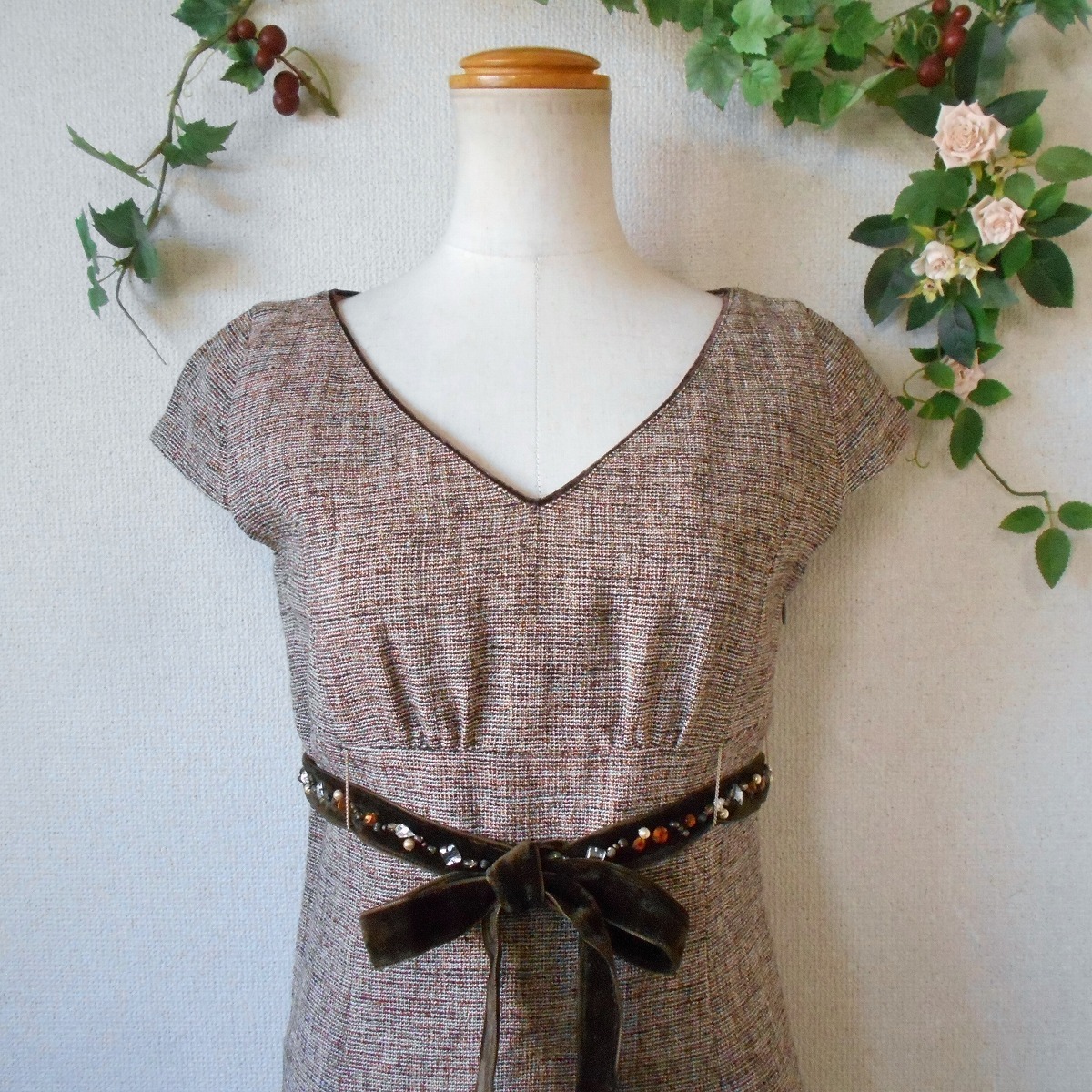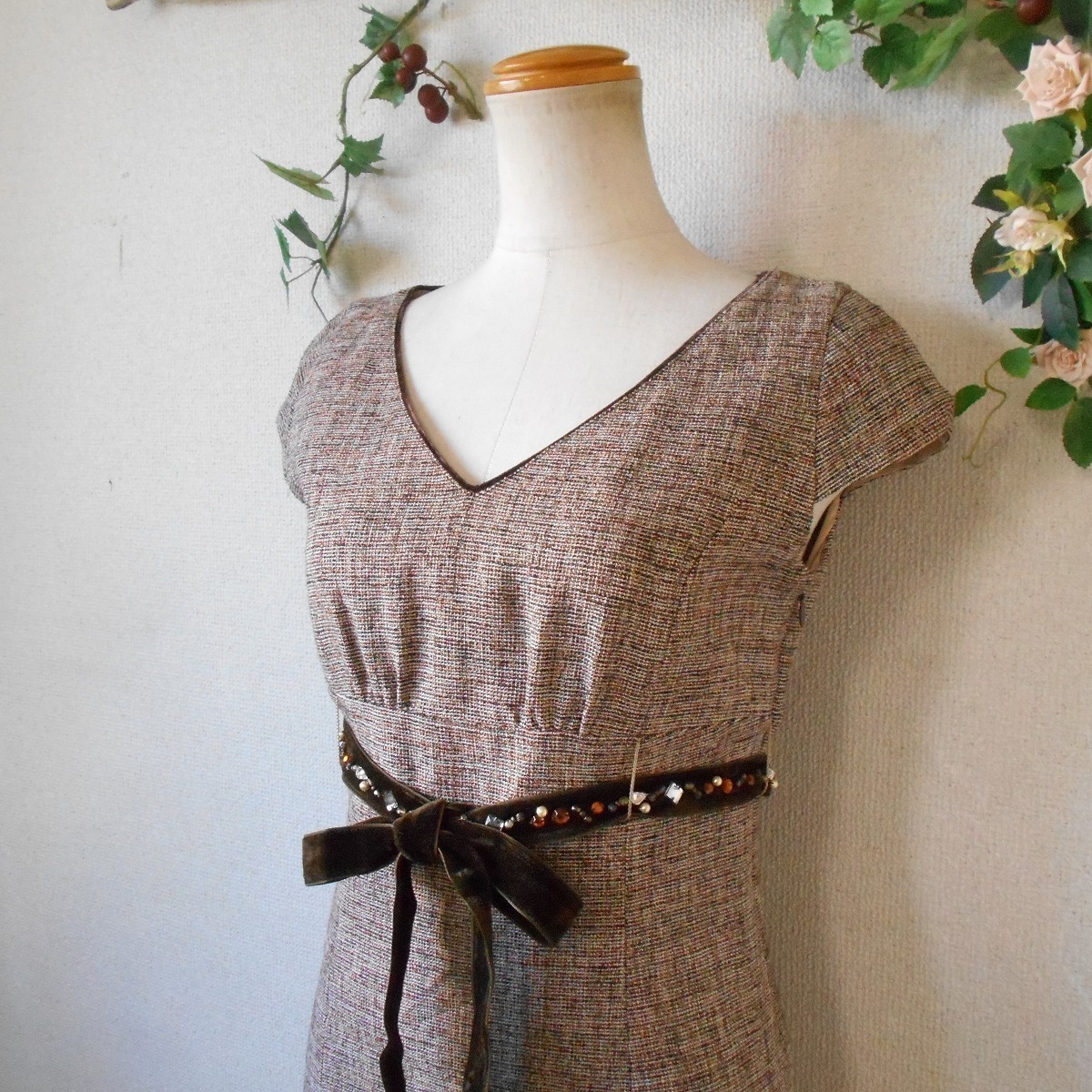 【ポイント】ロペのワンピースになります。お色は多色使用で全体的にはベージュっぽい感じです。秋冬春の3シーズン使えるお品でベロアリボンにはビジューが付いたとっても素敵な一着です。