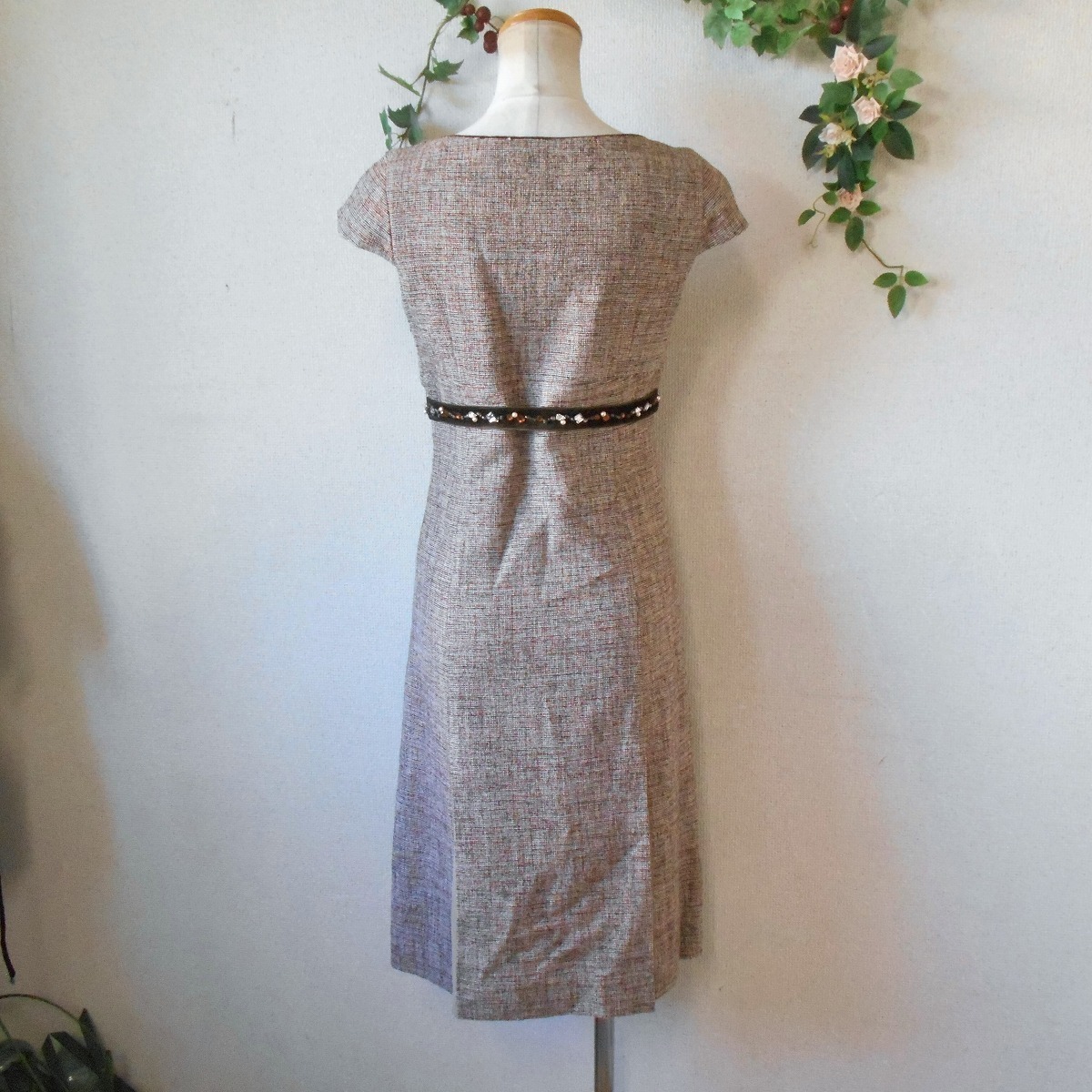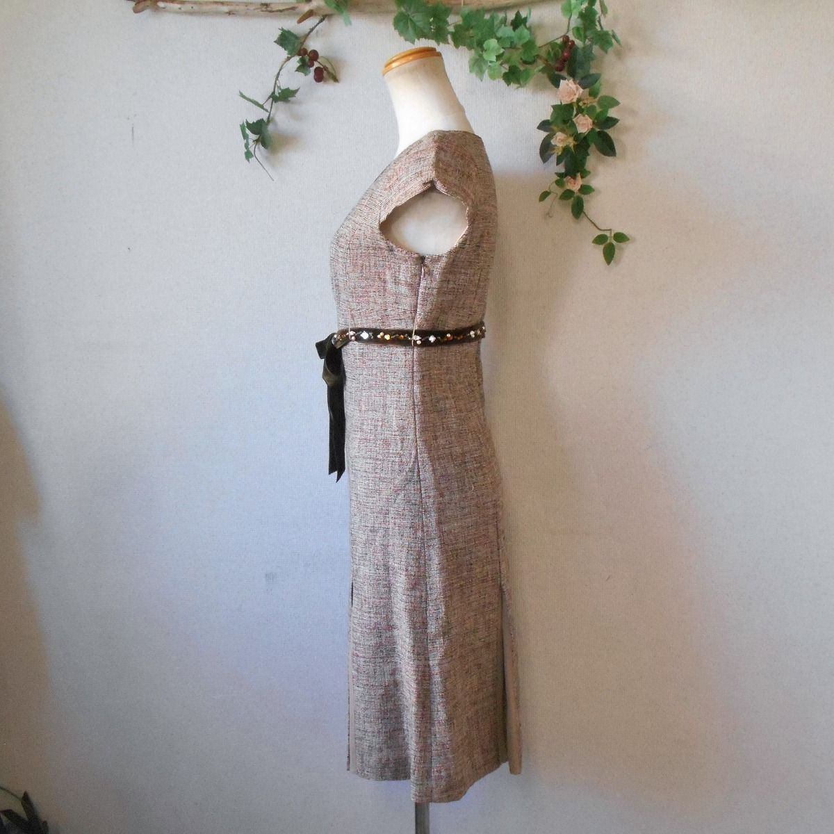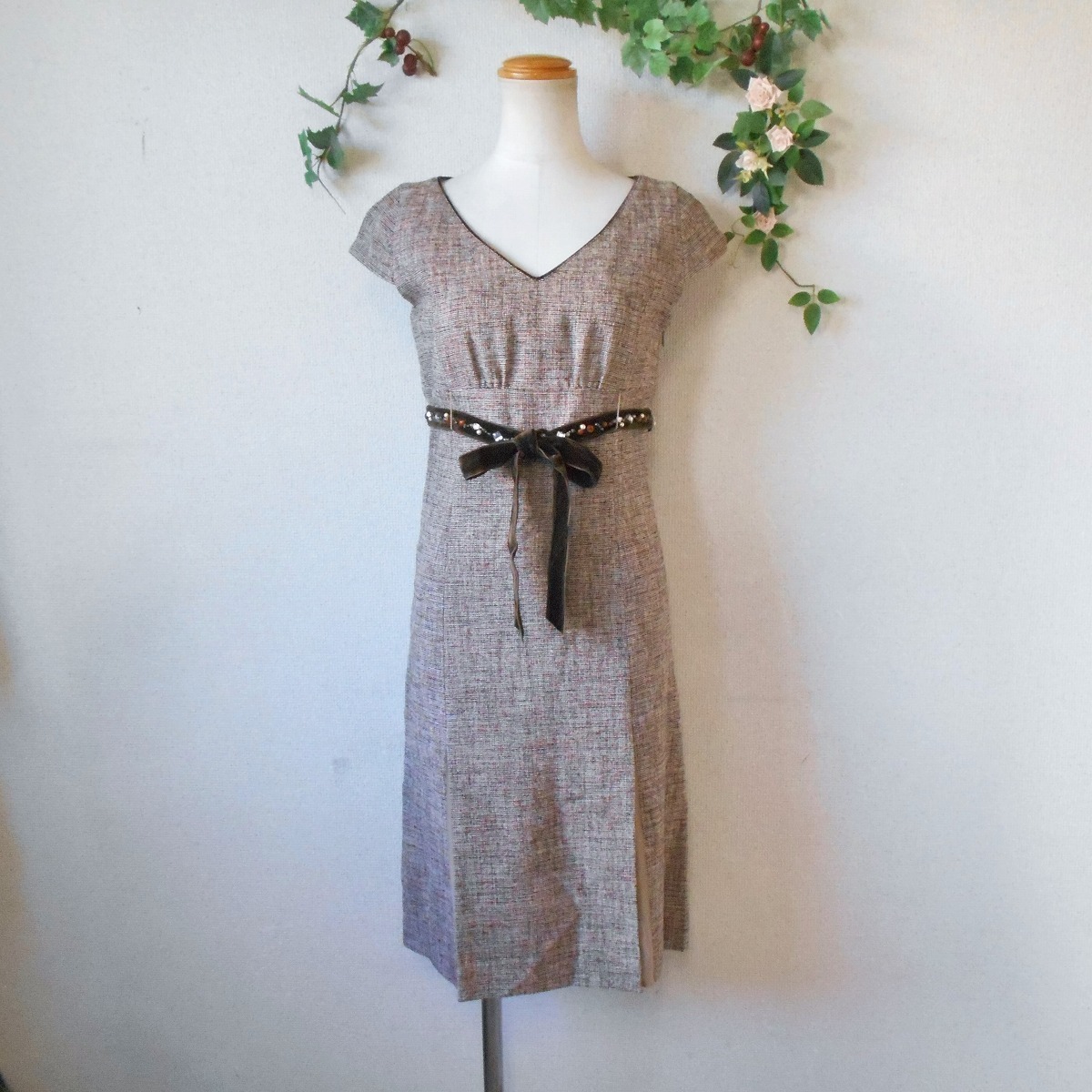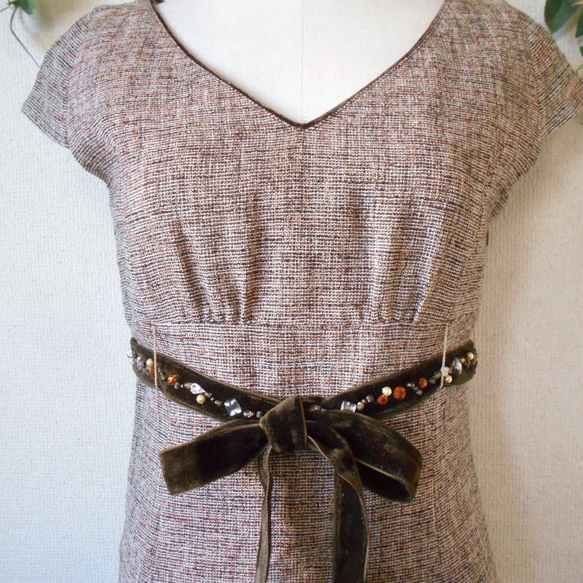 【ポイント】ロペのワンピースになります。お色は多色使用で全体的にはベージュっぽい感じです。秋冬春の3シーズン使えるお品でベロアリボンにはビジューが付いたとっても素敵な一着です。
